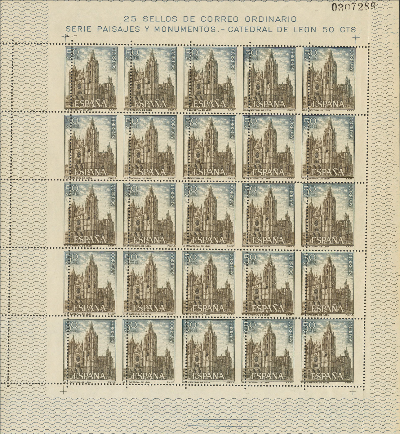 ★★ 1542dx(25). 1964. 50 cts black, gray and blue, complete sheet of twenty-five stamps. DISPLACED TOOTHED variety. MAGNIFICENT AND EXTRAORDINARY RARE, IT IS PROBABLY THE ONLY COMPLETE LEAF THAT CAN EXIST, A PIECE OF ENORMOUS SPECTACULARITY.
