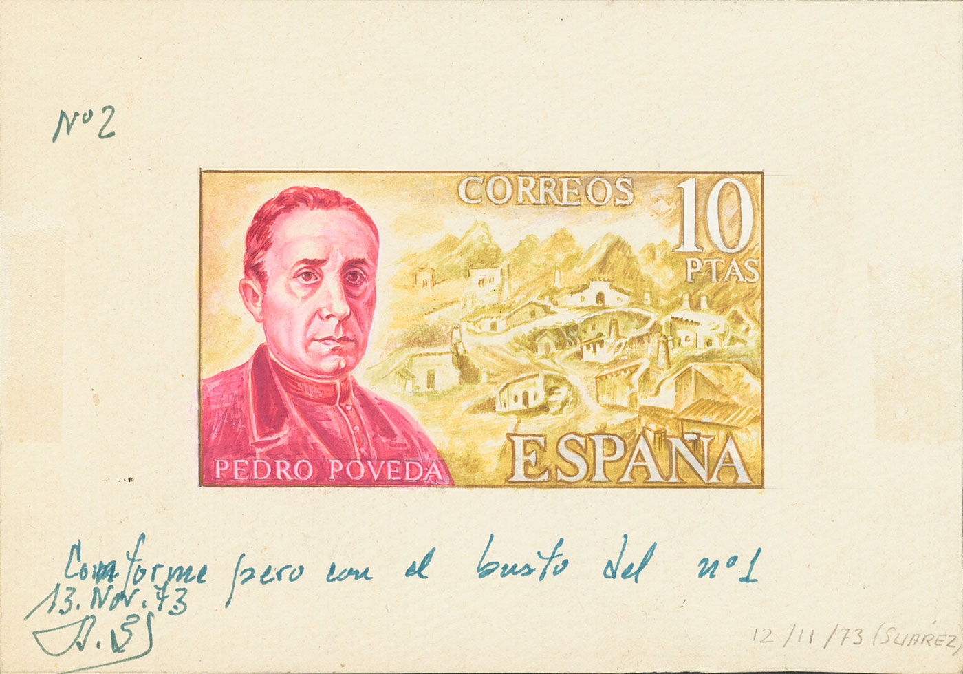(★) 2181P. 1974. 10 pts chestnut and carmine. PROOF OF THE FINAL PROJECT, drawn by the artist Suárez in watercolor and approved on November 13, 1973. MAGNIFICENT AND ONLY KNOWN.
