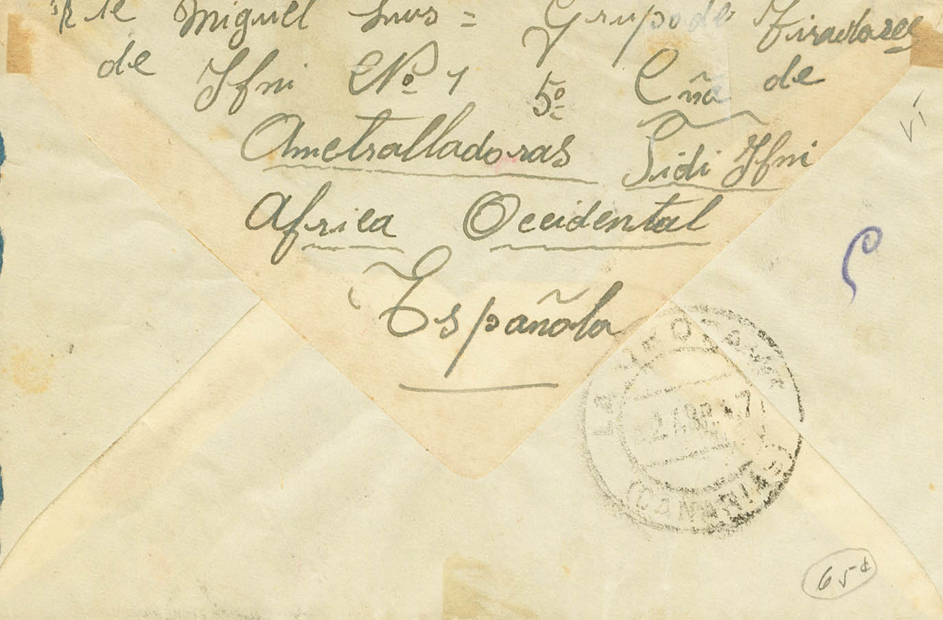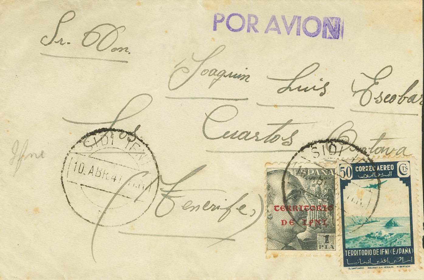 English 12, 30. 1947. 1 pts black and 50 cts blue. SIDI IFNI to LA OROTAVA. On the back arrival. MAGNIFICENT AND VERY RARE POSTAGE WITH THE VALUE OF 1 PTS OVERLOADED TRULY CIRCULATED.