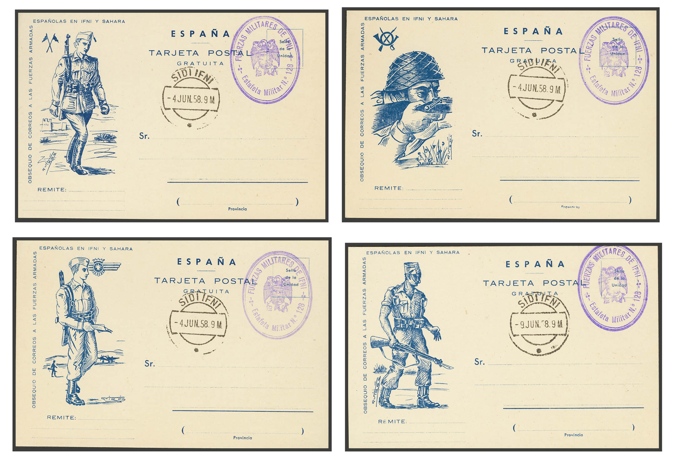 English EPM1/10. 1958. Set of ten Military Postcards. On the front, in the place provided for postage, the franchise mark of the IFNI MILITARY FORCES / MILITARY ESTAFETA Nº128 unit is stamped (except for EPM1, dedicated to the Army, which has no mark) and next to it the date stamp. SIDI IFNI / * (the envelope where the original set was kept is included). MAGNIFICENT AND EXTRAORDINARY RARE SET, WE ONLY ARE AWARE OF THE EXISTENCE OF ANOTHER SET THAT ILLUSTRATES THE EDIFIL CATALOG, THESE CARDS WERE DELIVERED TO THE FORCES FEATURED IN IFNI AT THE END OF THE WAR AGAINST THE MOROCCAN ARMY, FOR PROPAGANDISTIC PURPOSES AND RECOGNITION OF THEIR SERVICES.