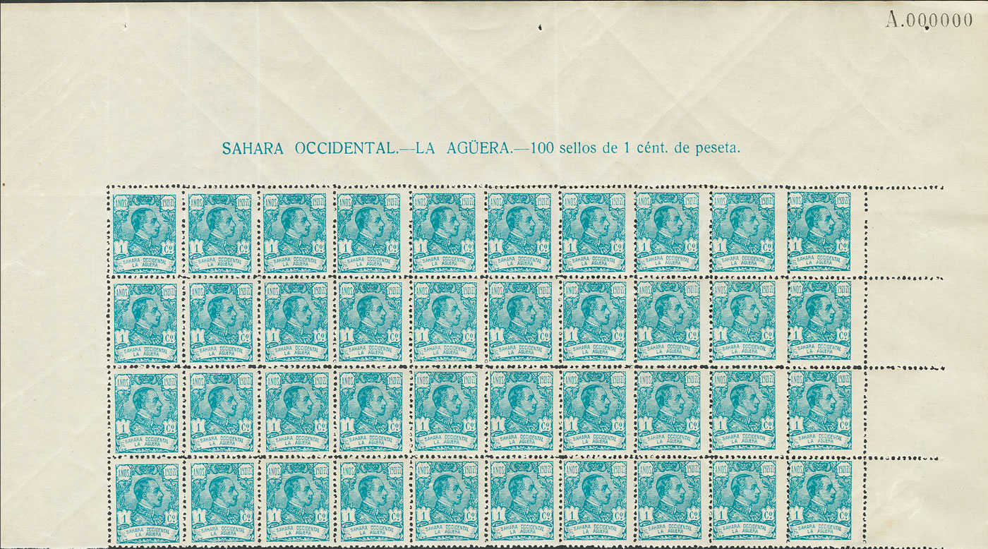 ★★ 14a(40). 1923. 1 cts blue, block of forty, sheet header. All values with the variety WITHOUT DIERESIS IN THE "U" OF AGÜERA. MAGNIFICENT AND SPECTACULAR, WITHOUT A DOUBT IT IS THE LARGEST KNOWN BLOCK AND THE MOST IMPORTANT PIECE OF THIS VERY RARE COLONY. Edifil 2013: +8,000 Euros