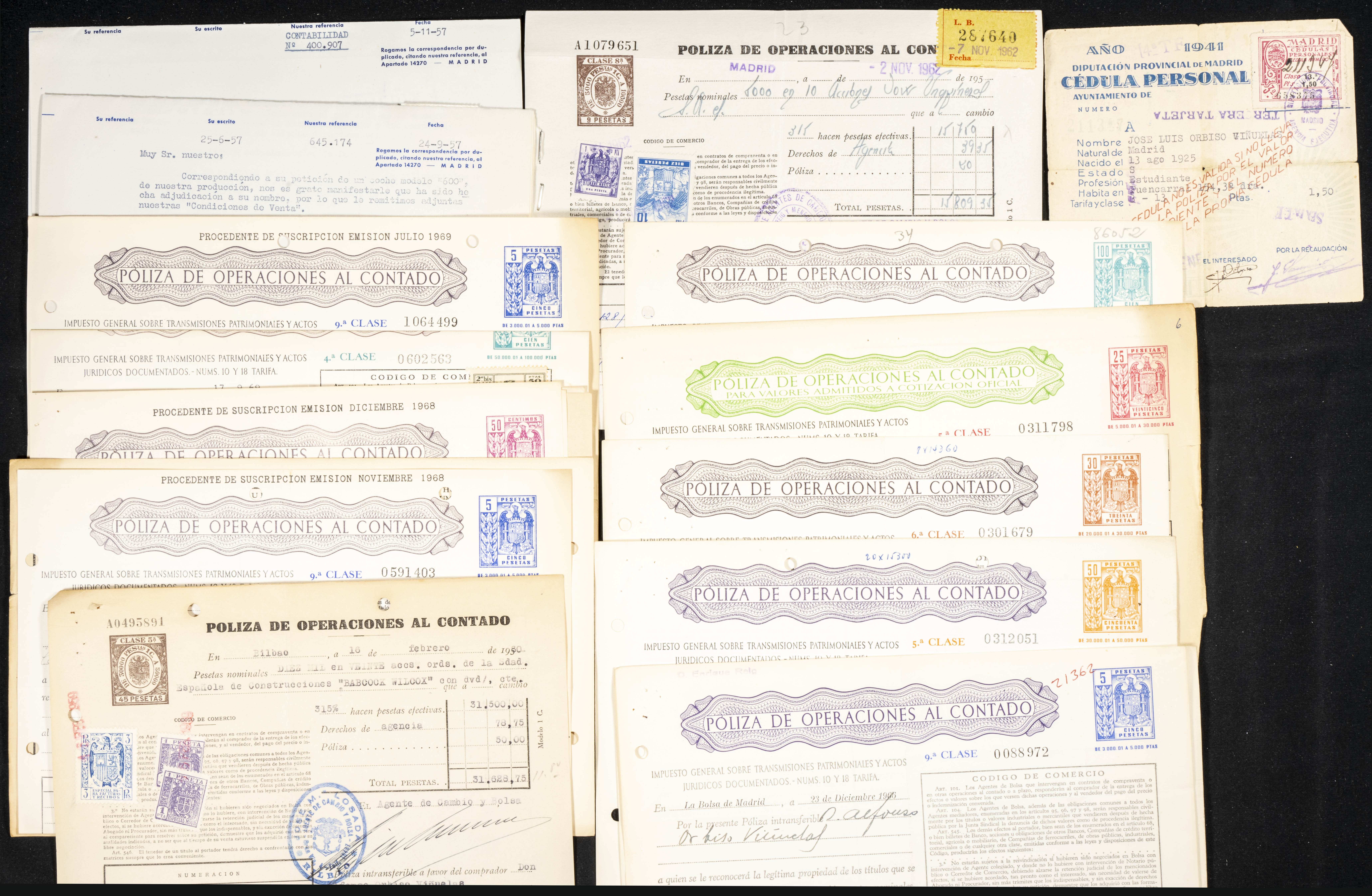 (1950ca). Set of various documents franked with Money Transfer and Mobile Stamps prosecutors, most of them documents from Stock Market Operations and Bills of Exchange. TO EXAMINE.