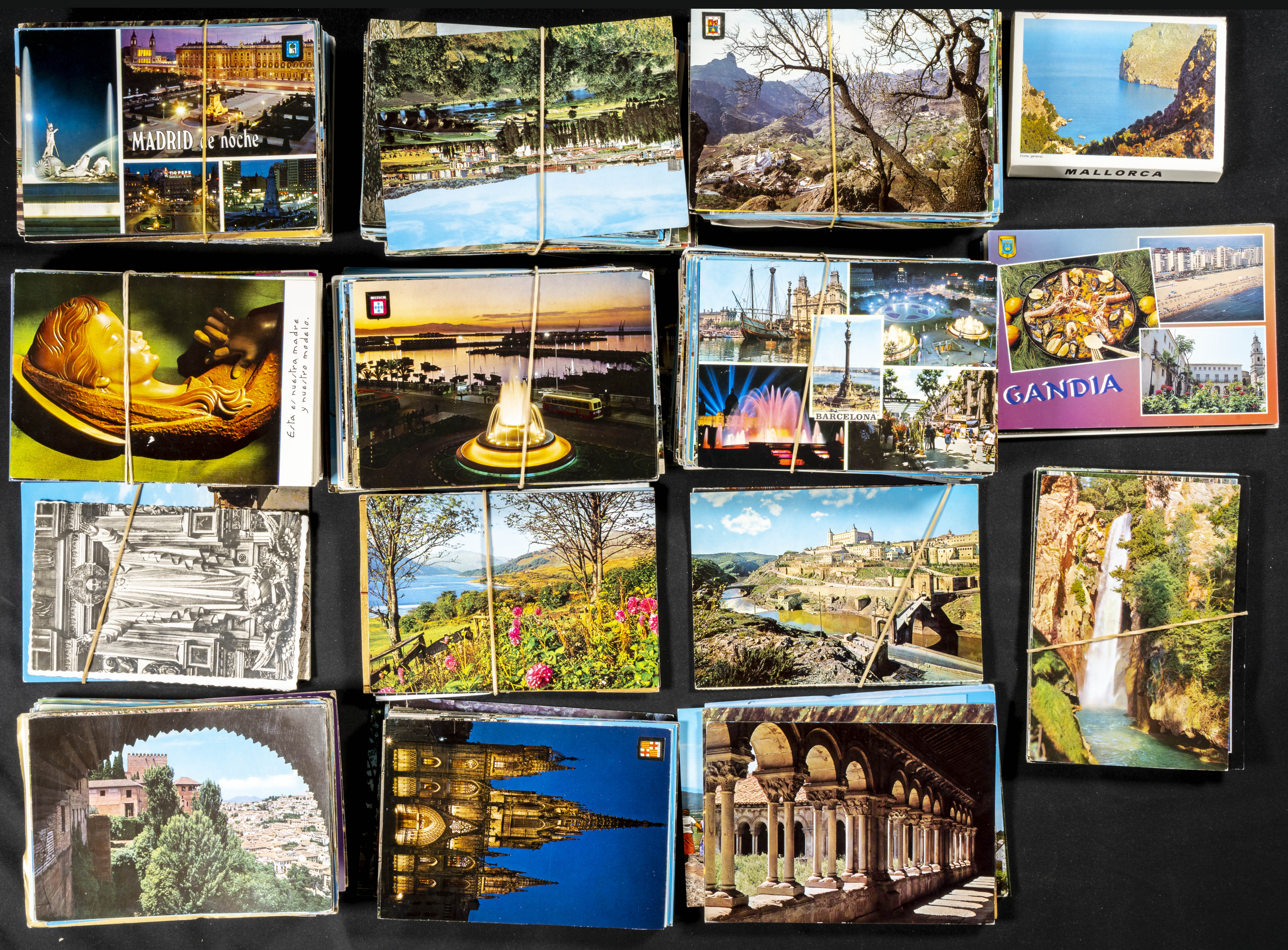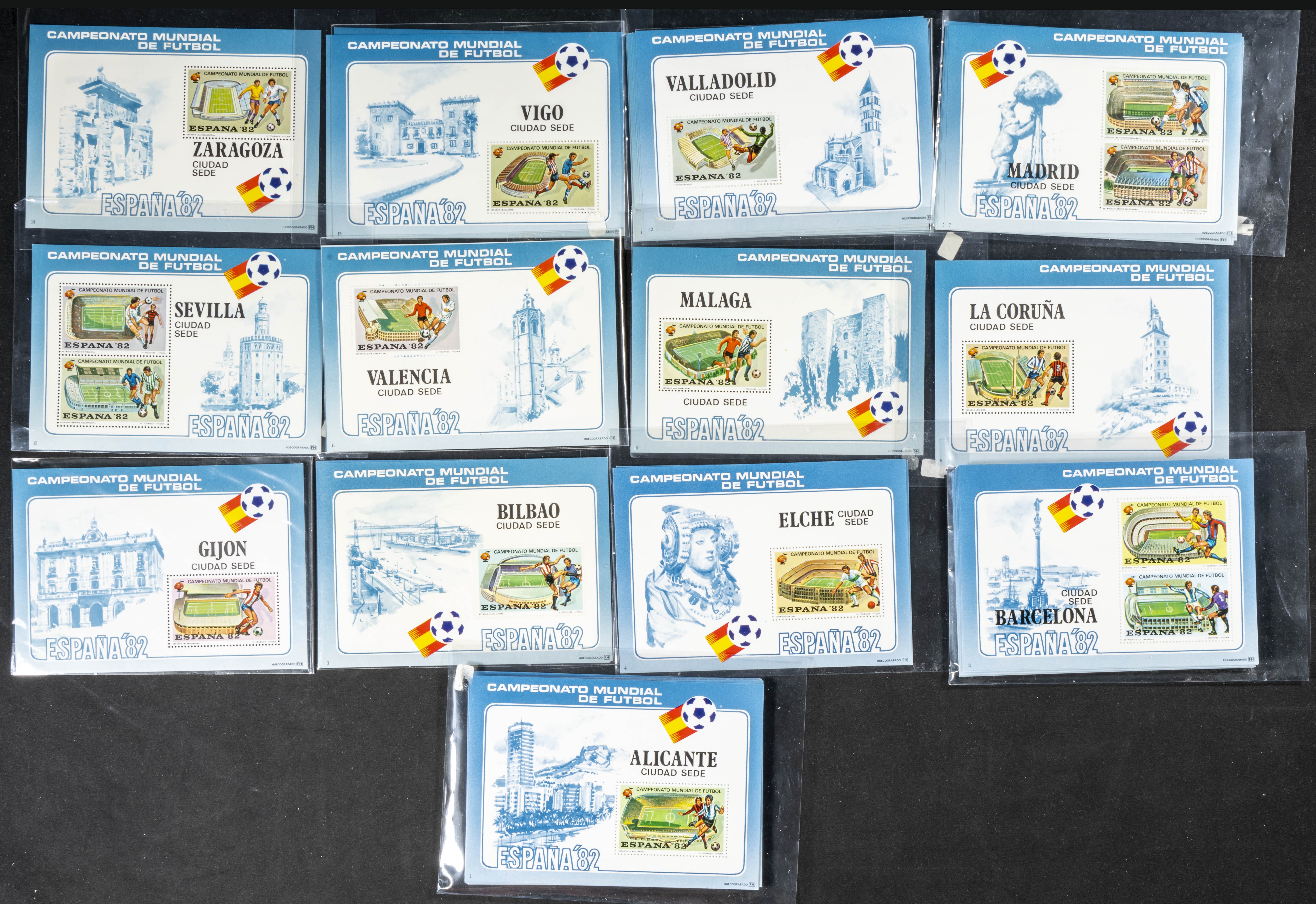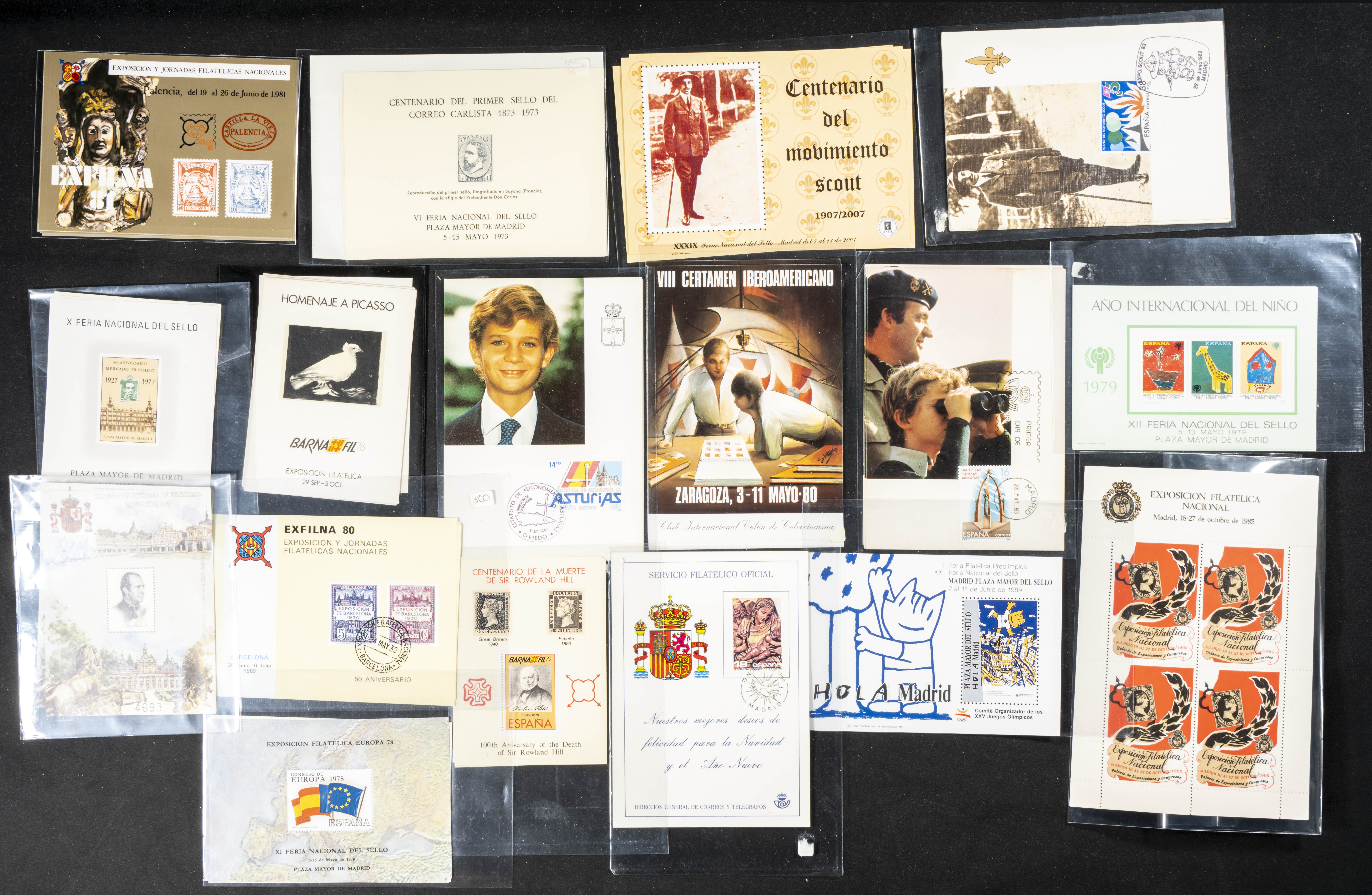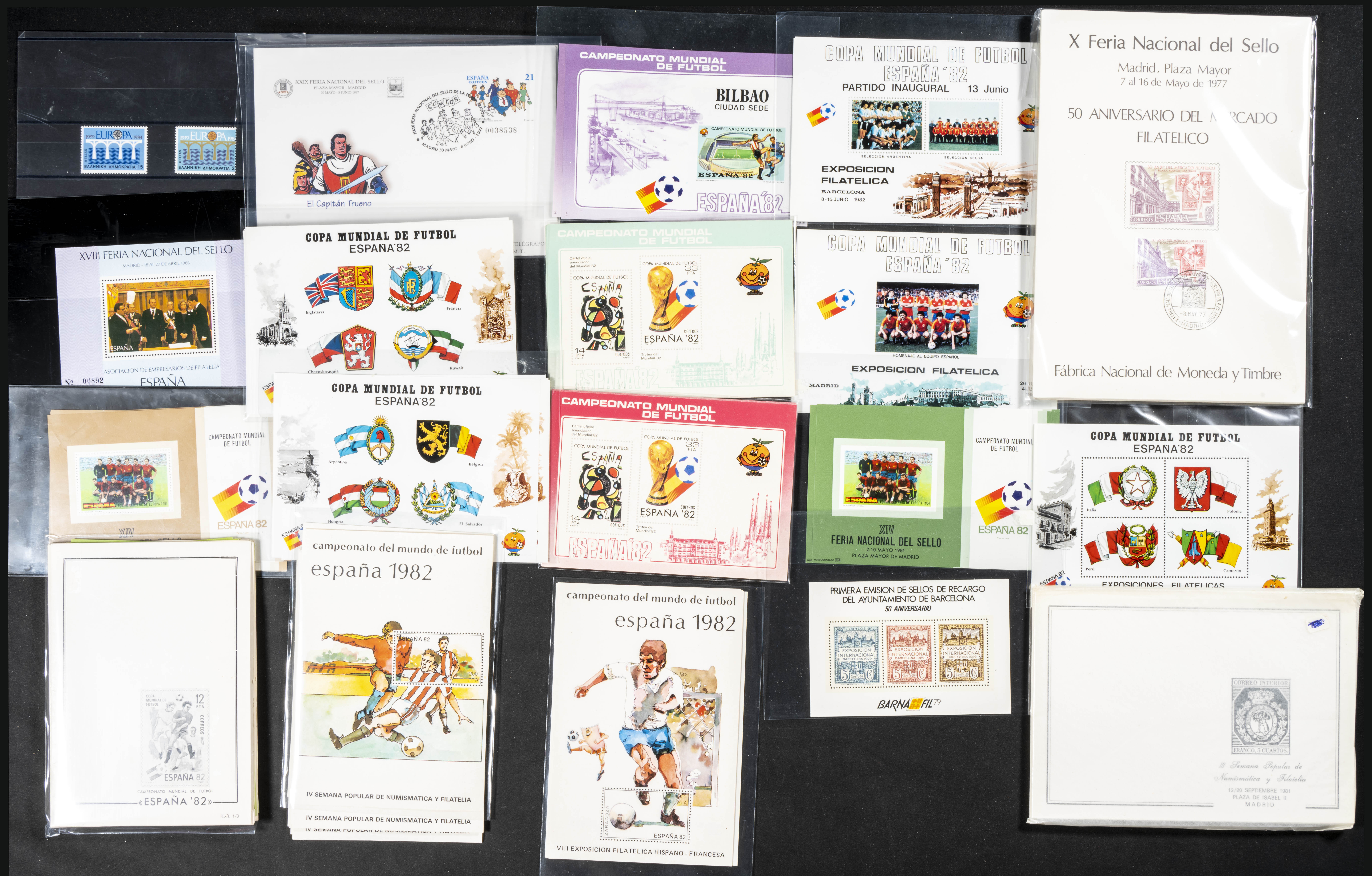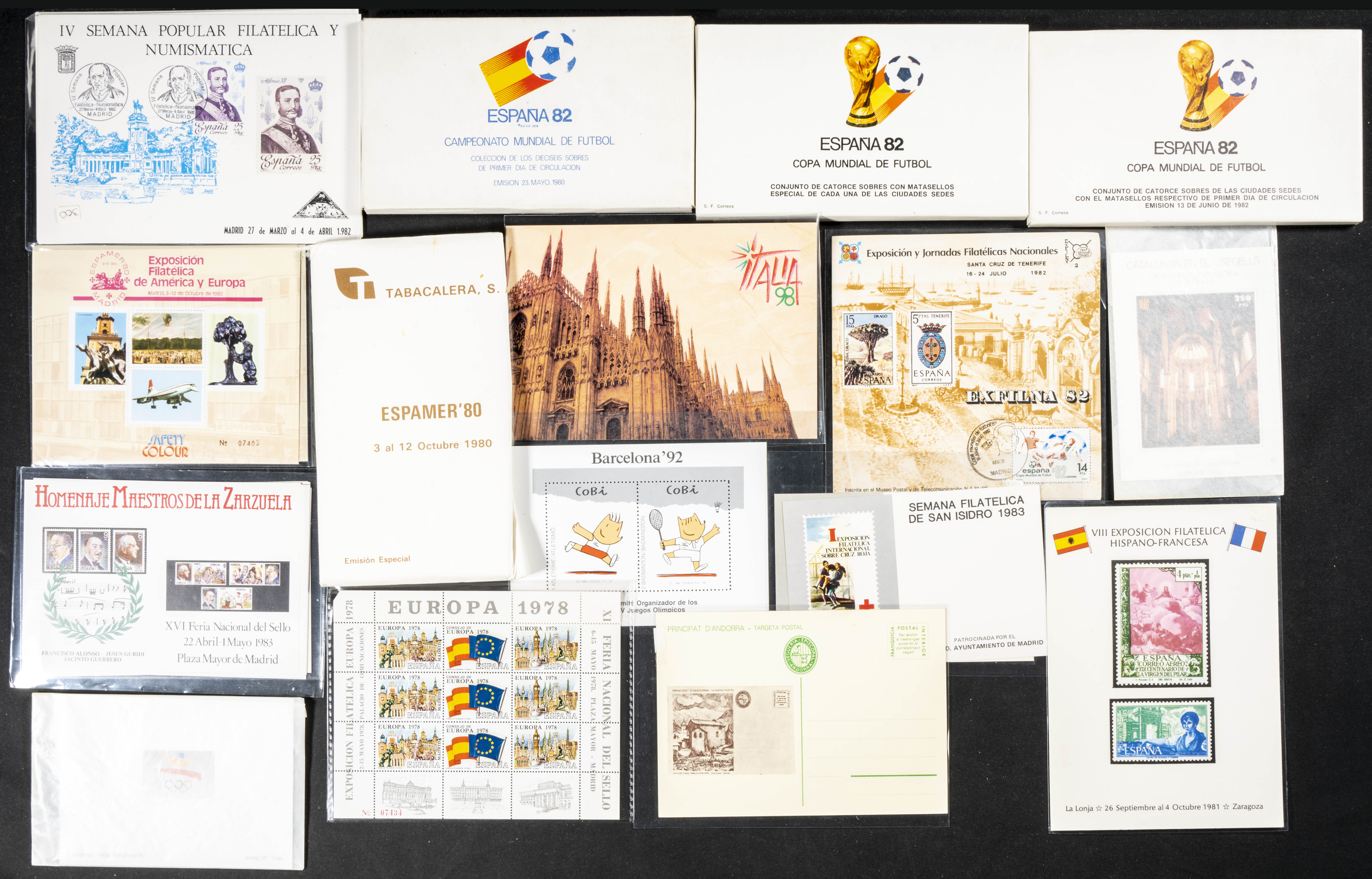 (1980ca). Set of more than eighty philatelic documents, dozens of souvenir sheets, first day covers, more than a thousand used stamps and hundreds of modern postcards, includes several folders or coin cases from the period of Don Juan Carlos I and several dozen block sheets of the 82 World Cup venues. TO EXAMINE.