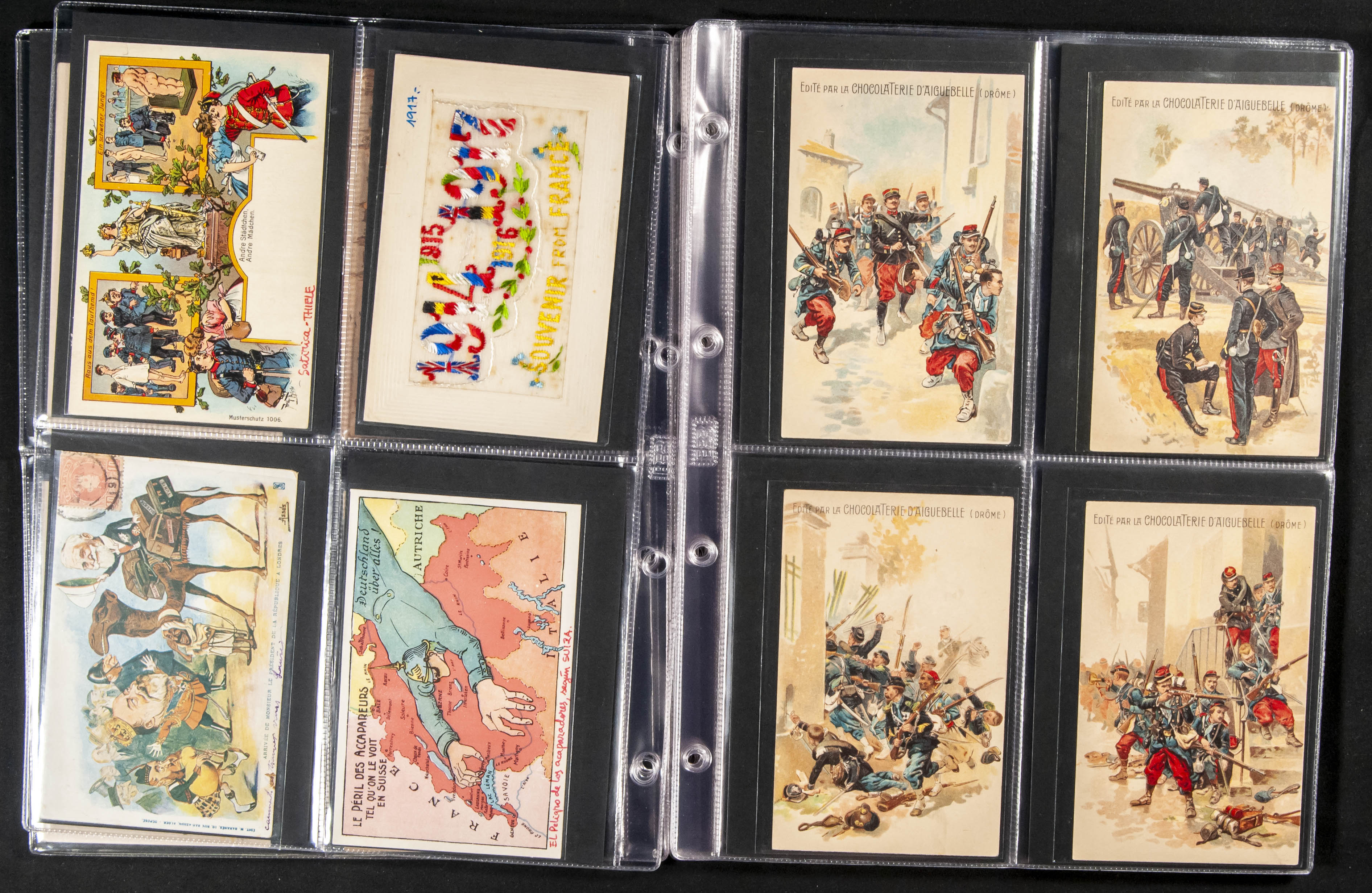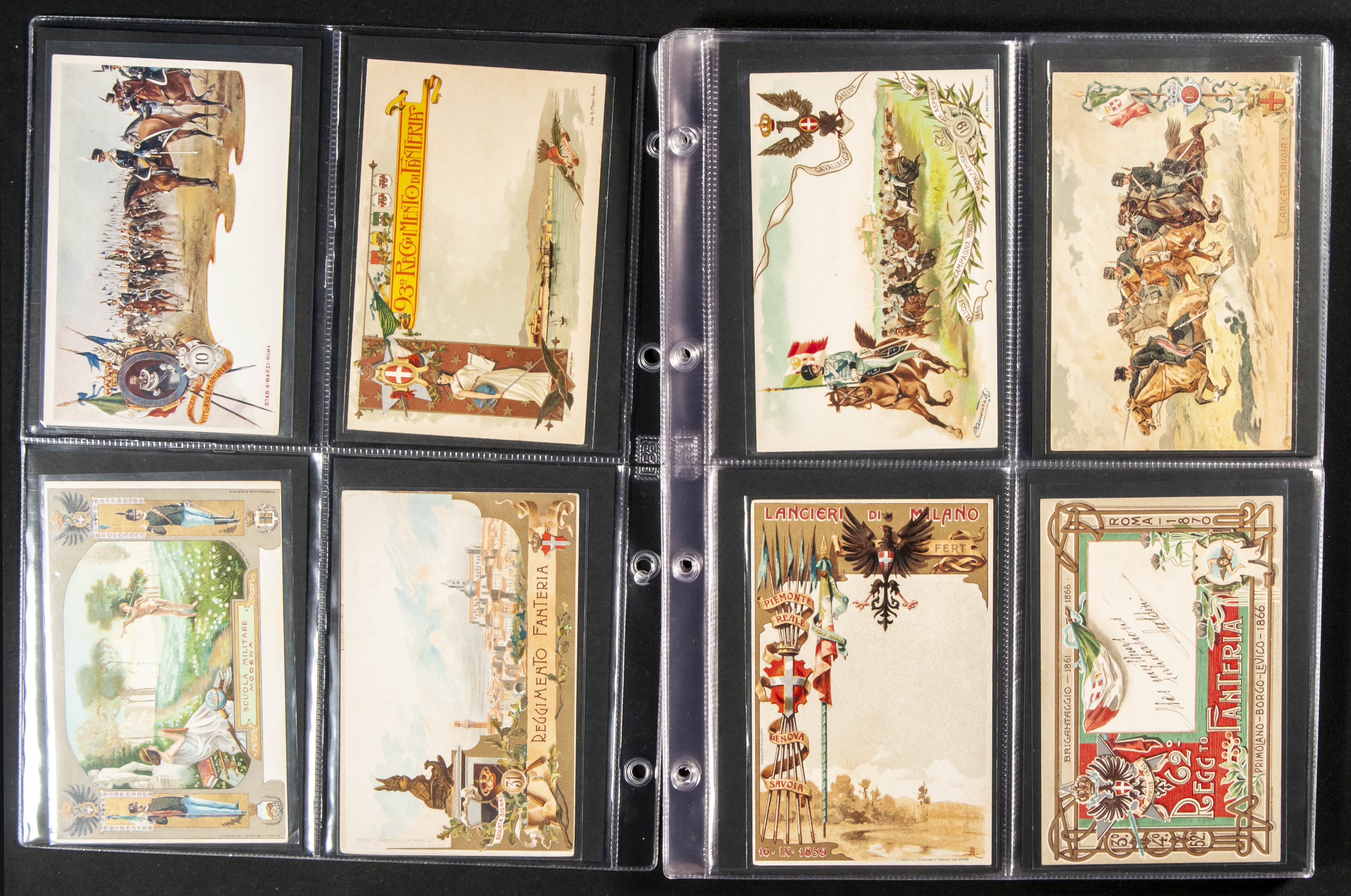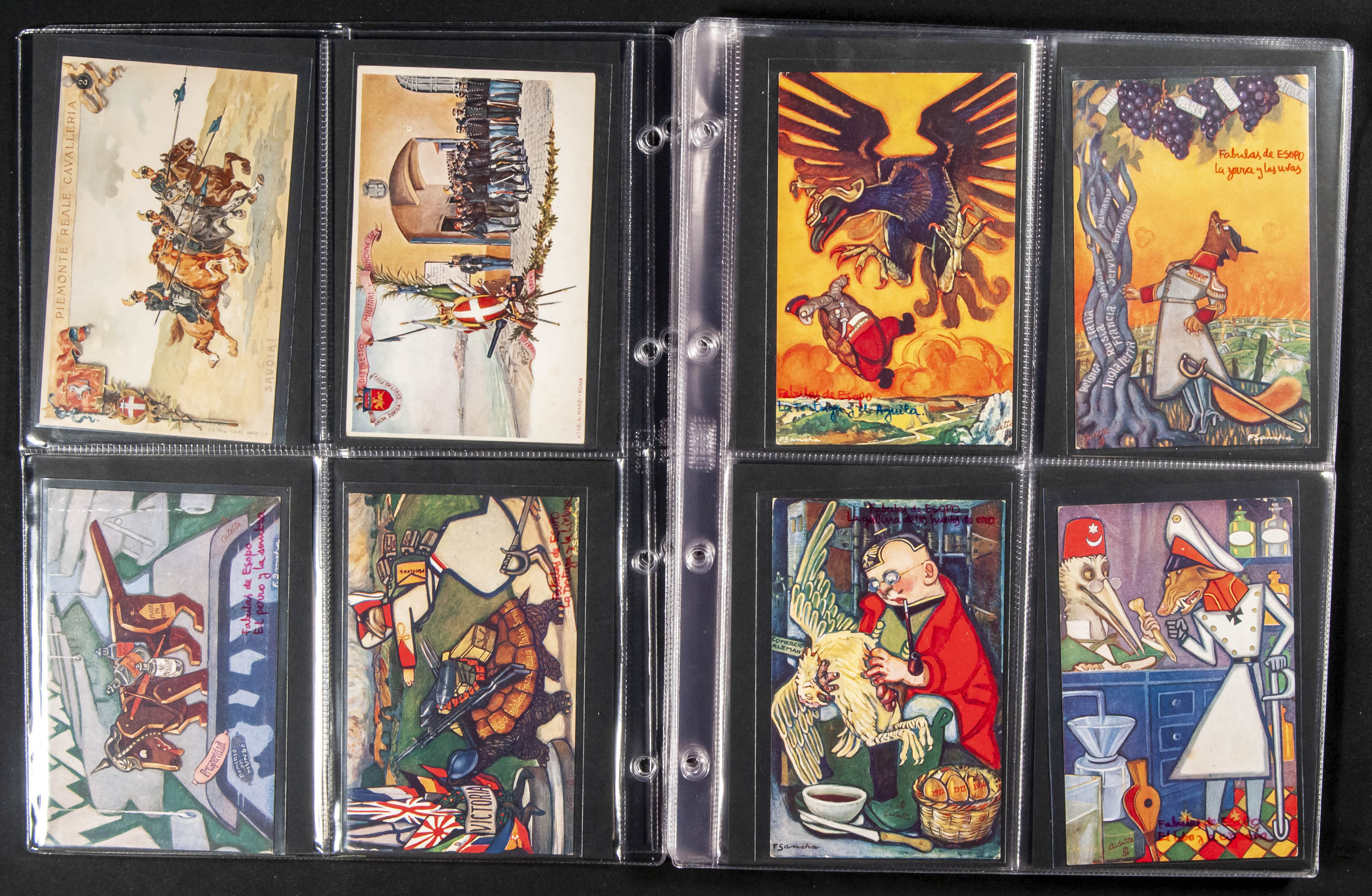 (★)(1900ca). Interesting set of more than seventy-five postcards with military motifs (Italian Regiments, Fables, Advertising) and World War I and II, as well as some characters (some stamped). TO EXAMINE.