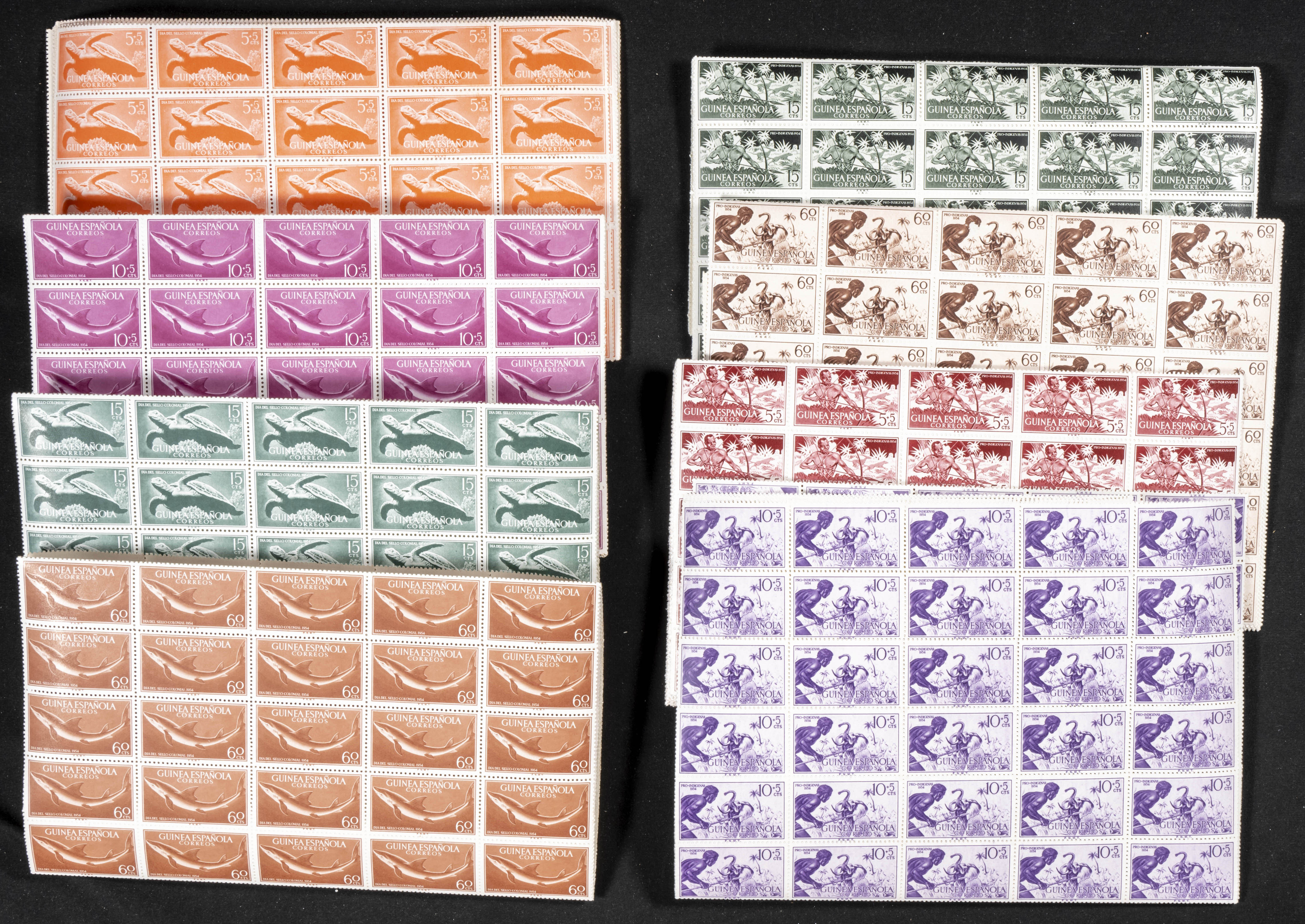 ★★(1954ca). Set of three hundred new series from each of Guinea: Pro Indígenas y Fauna 1954, Flora 1956, Fauna 1957 and Deportes 1959 (Edifil: 334/61(300), 358/61(300), 369/72(300), 395/ 97(300)). TO EXAMINE.