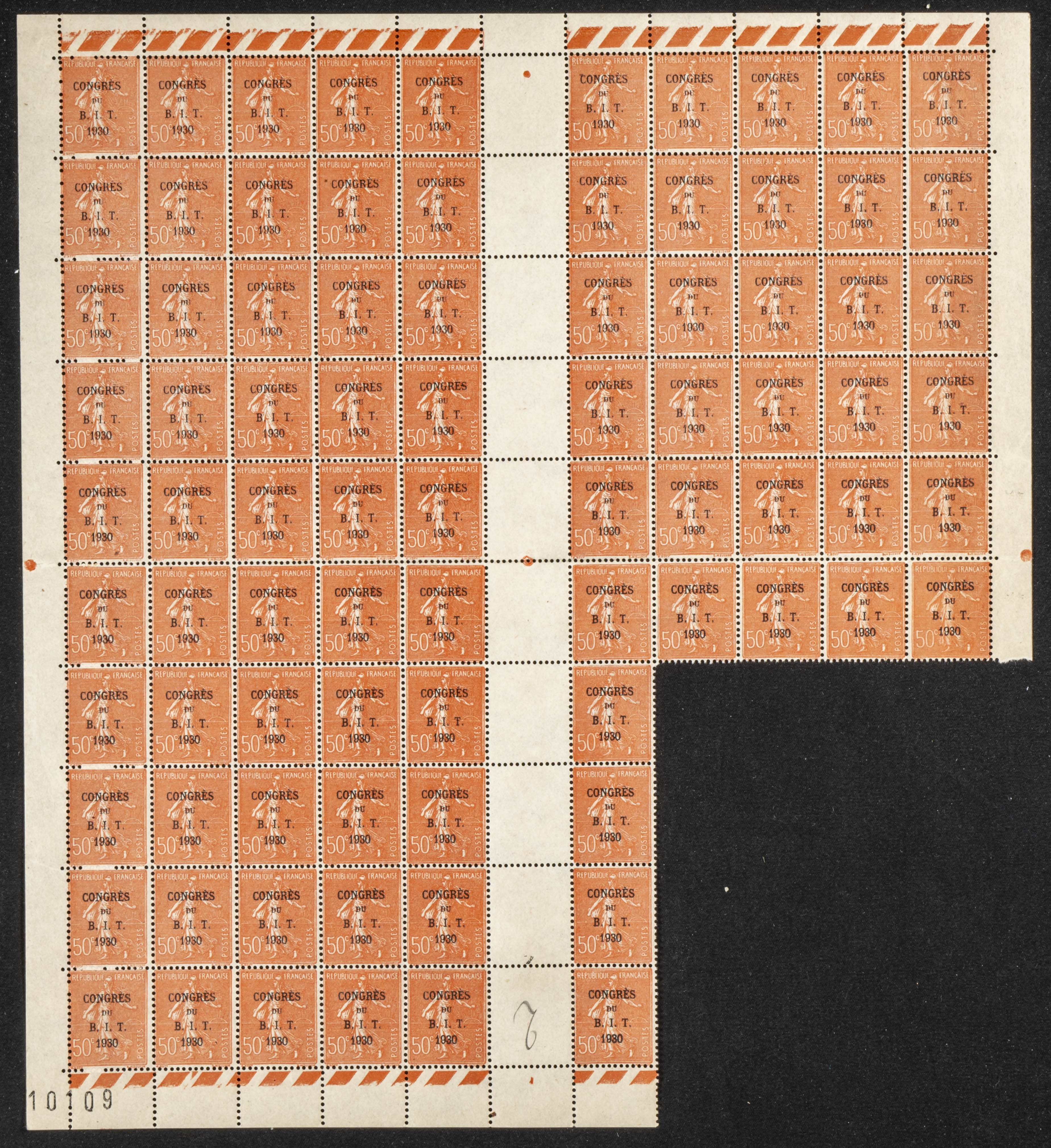 ★★Yvert 264(84). 1930. Eighty-four 50 ct orange stamps (Congres du BIT) from France. TO EXAMINE. Yvert 2023: 588 Euros