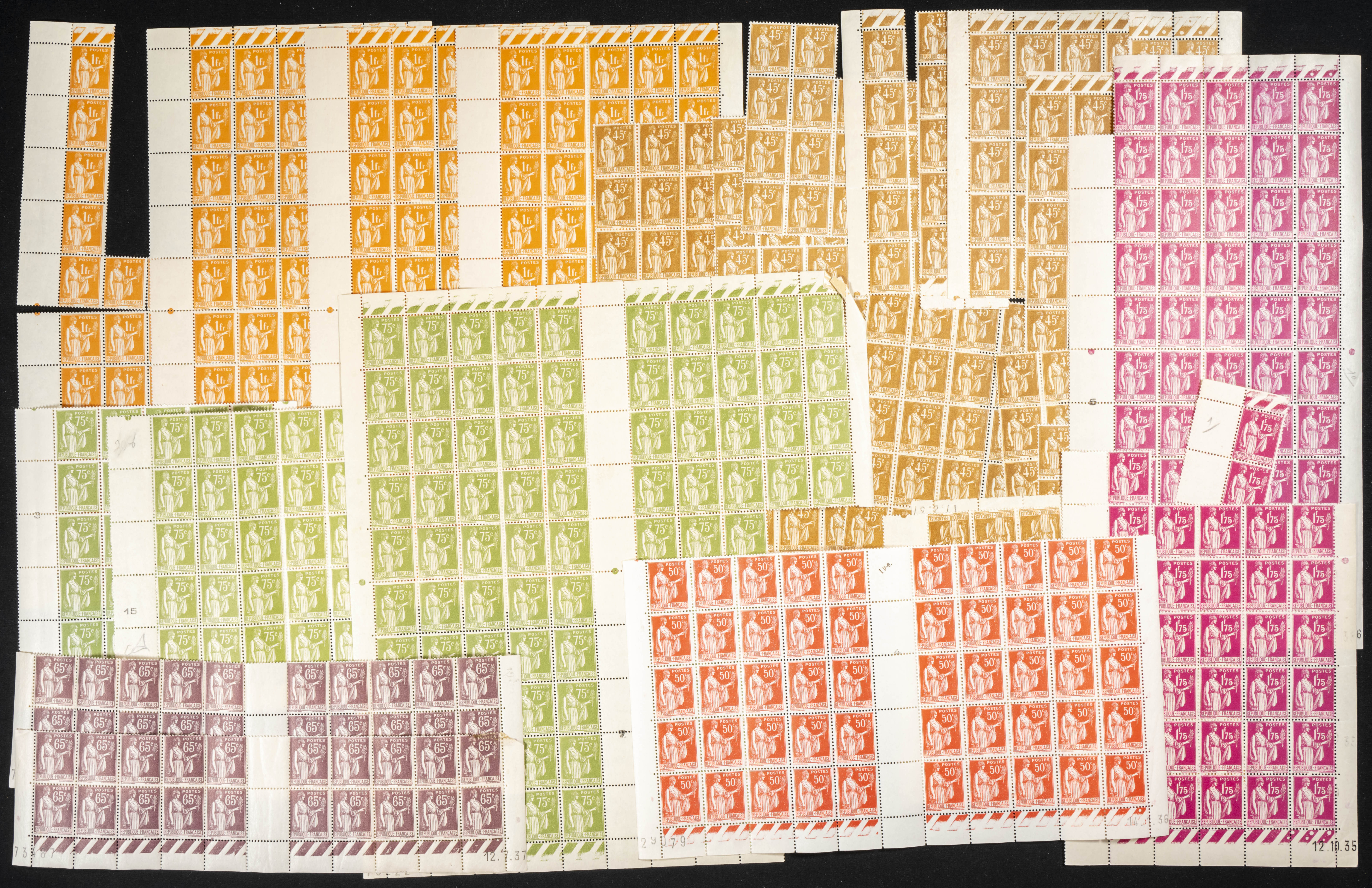 ★★ 280, 282/84A, 286, 288/89. 1932. Set of more than two thousand four hundred stamps of the 1932 Peace type issue of France, 30 cts (three hundred stamps), 45 cts (two hundred and eighty-four stamps), 50 cts (two hundred and fifty stamps), 65 cts (four hundred and eighty stamps), 75 cts (four hundred and thirty-eight stamps), 1 f (one hundred and seventy-nine stamps), 1.50 f blue (five hundred stamps) and 1.75 f (eighty-four stamps), in sheets or large blocks ( good quality). TO EXAMINE. Edifil 2014: +5,800 Euros