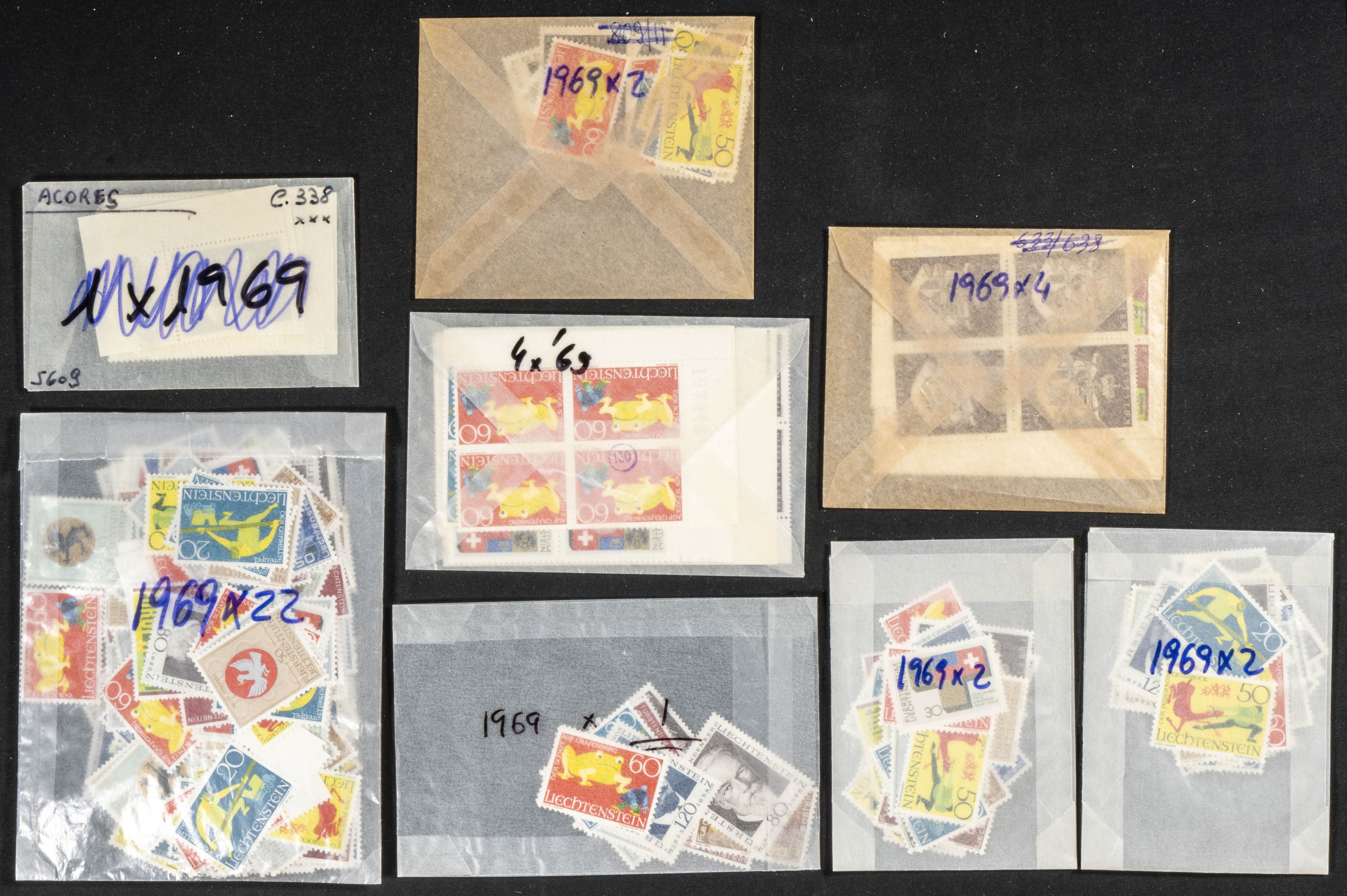 ★★Yvert 454/68(39). 1969. Thirty-nine complete 1969 set from Liechtenstein (in mixed envelopes). TO EXAMINE. Yvert 2019: 682 Euros