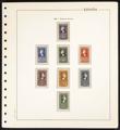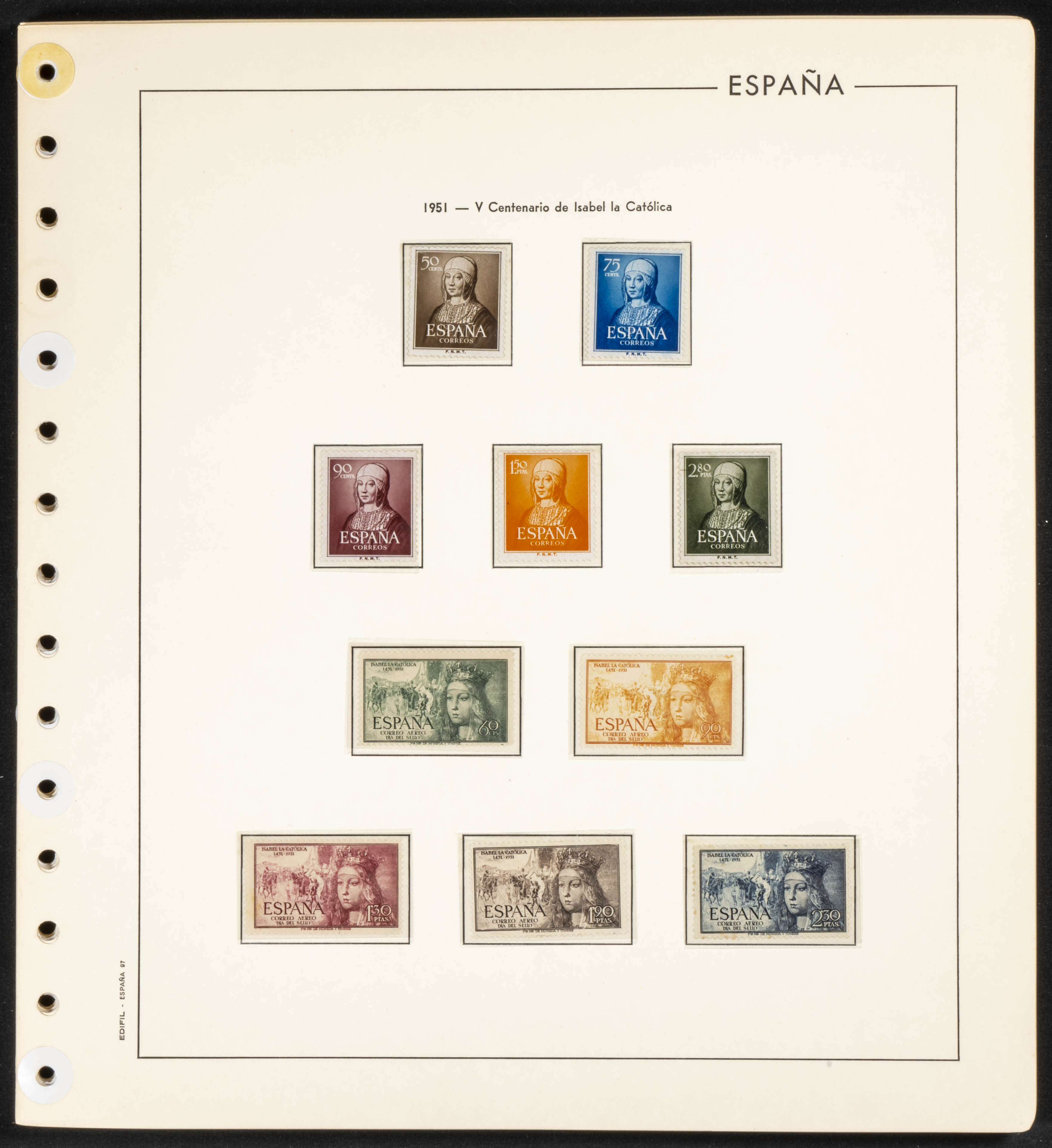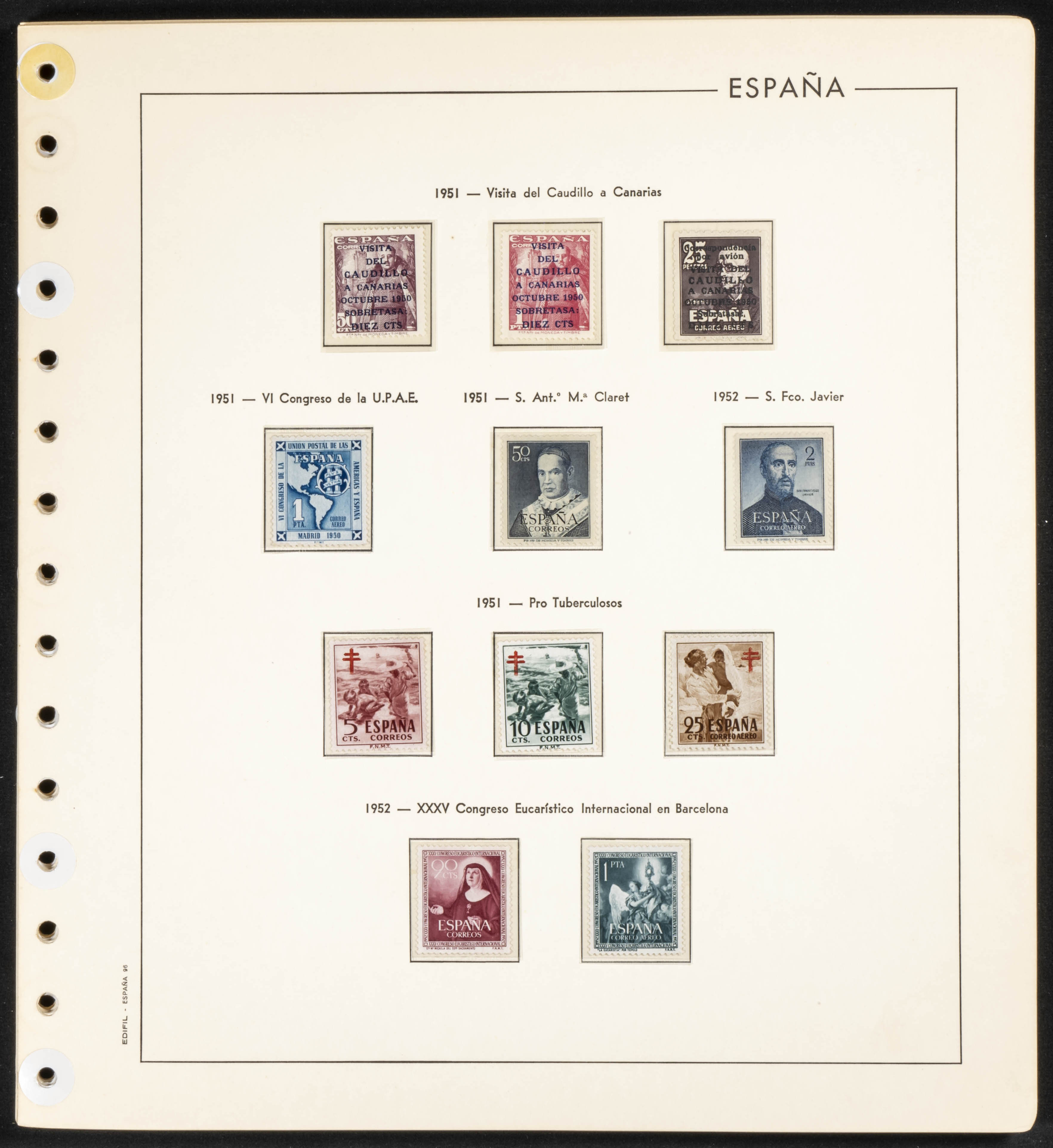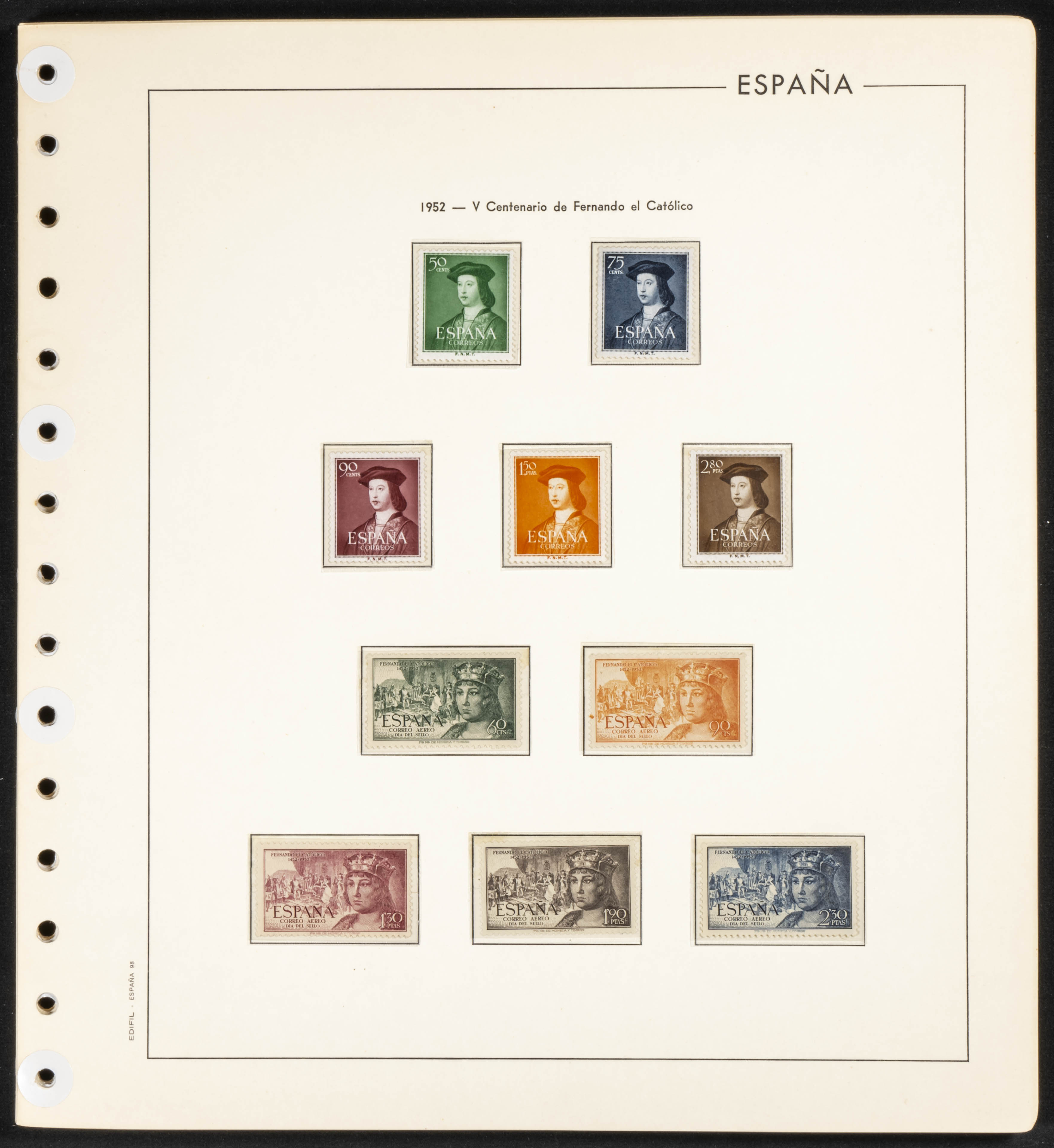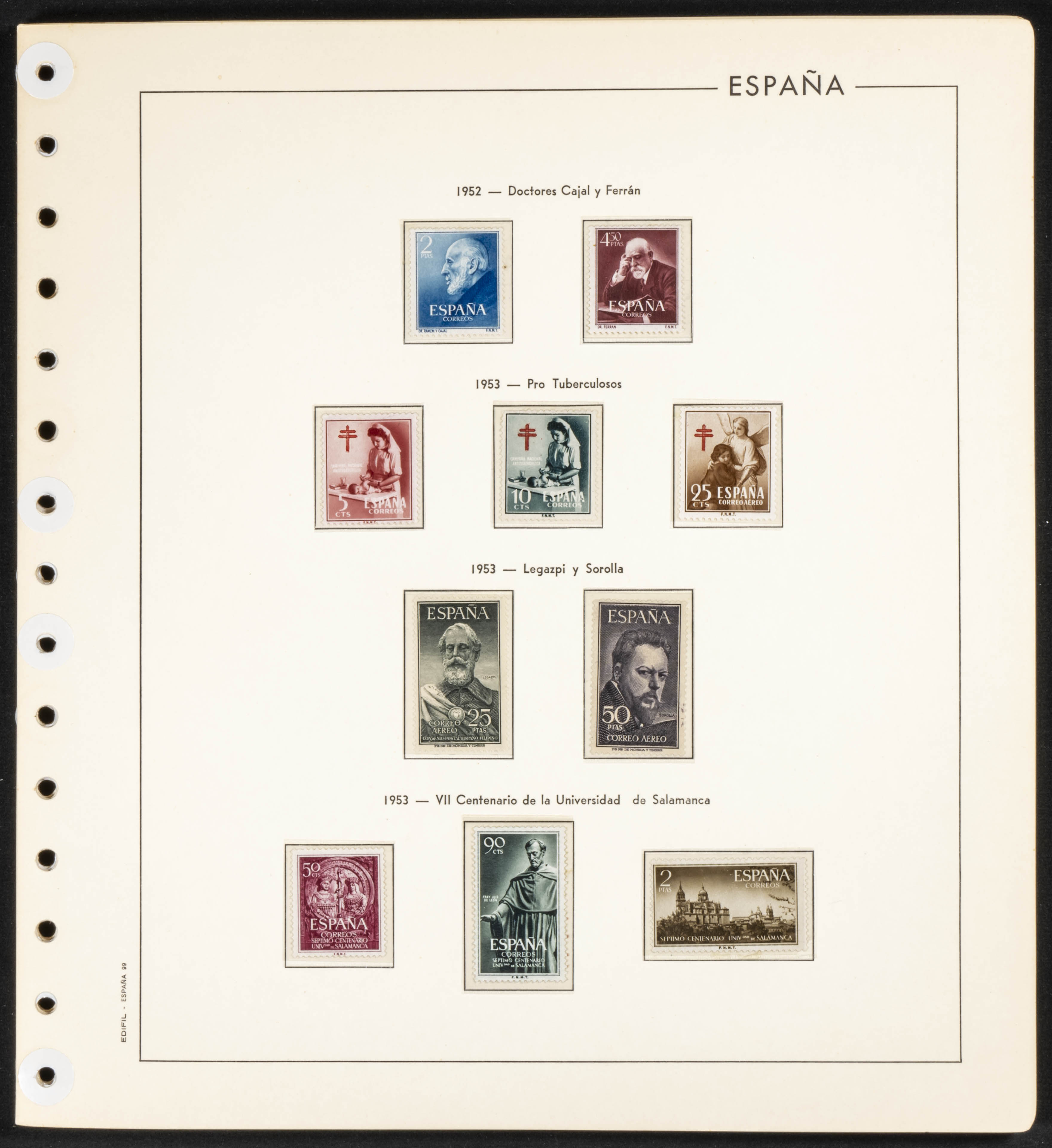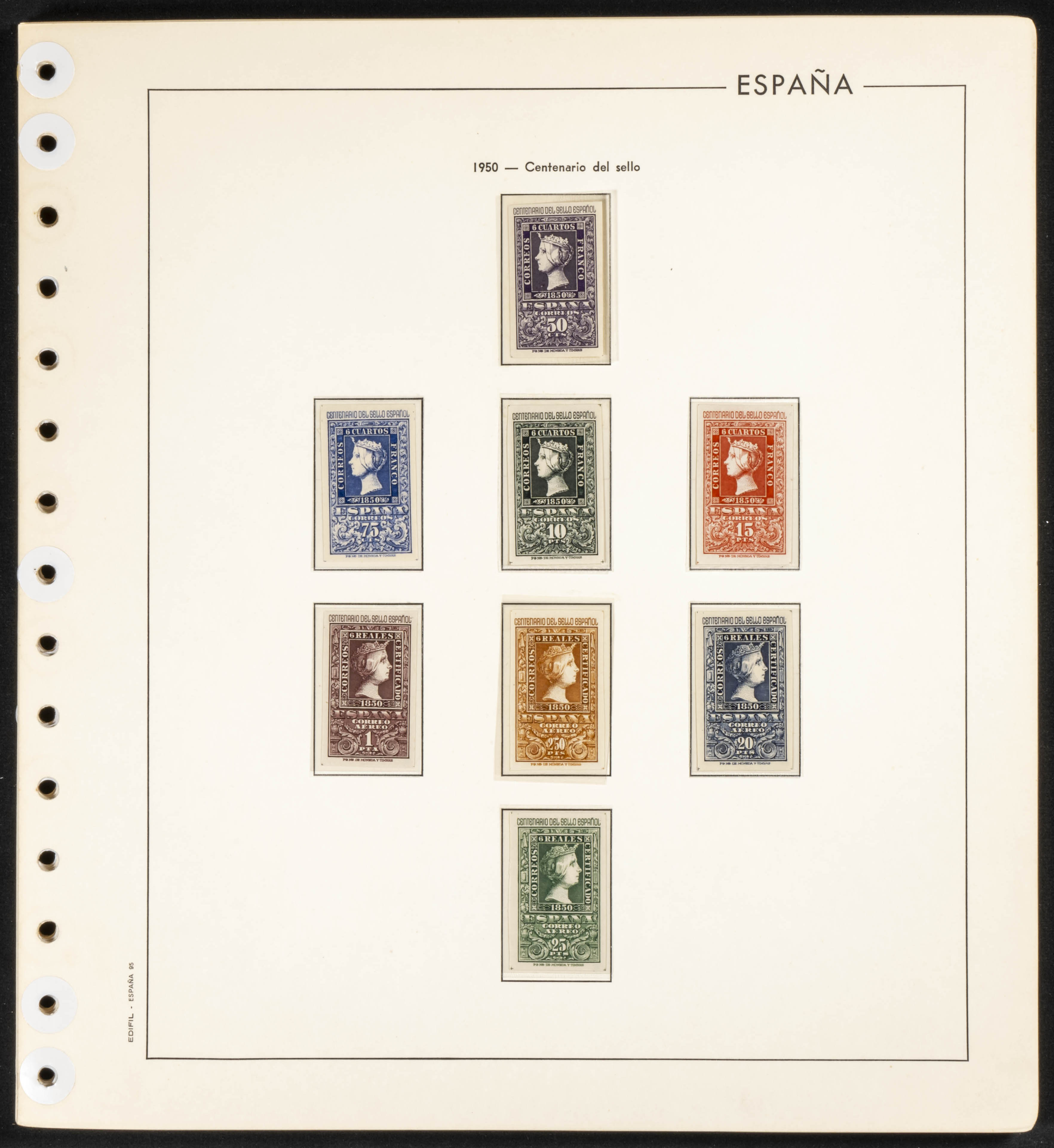 English ★★/★(1950ca). Collection of the 2nd Centenary from 1950 to 2005, in new condition (in the first part it has a stamp fixer on many of the stamps and even some spots of rust) (Centenario 15 pts and 20 thinned pts, Caudillo without number and "Legazpi and Sorolla" with a stamp fixer , Leader with number without seals and exceptional centering). TO EXAMINE.