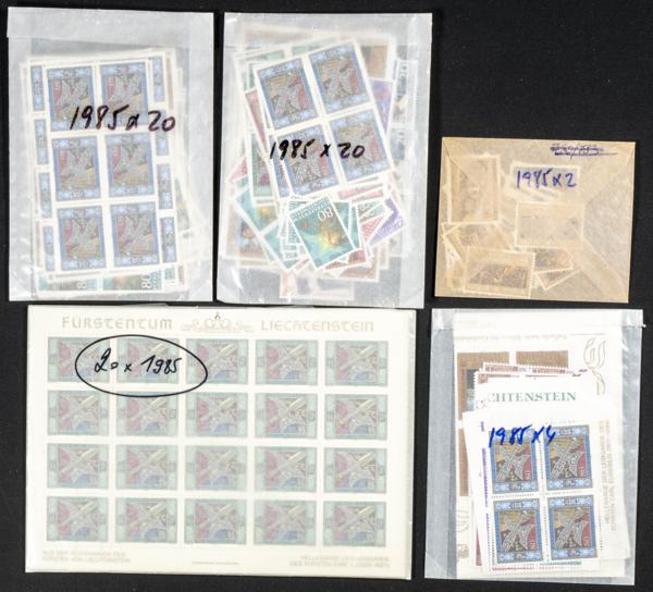 ★★Yvert 807/33(66). 1985. Complete sixty-six year set of 1985 (does not include block sheet stamps) from Liechtenstein (in mixed envelopes). TO EXAMINE. Yvert 2019: 2,046 Euros