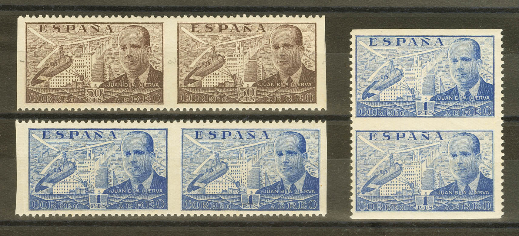 ★★ 883/84sv(2). 1939. 50 cts chestnut and 1 pts blue, in a pair WITHOUT VERTICAL TEETH and 1 pts blue, in a pair WITHOUT HORIZONTAL TEETH (slight age stains). PRETTY. Edifil 2021: 150 Euros
