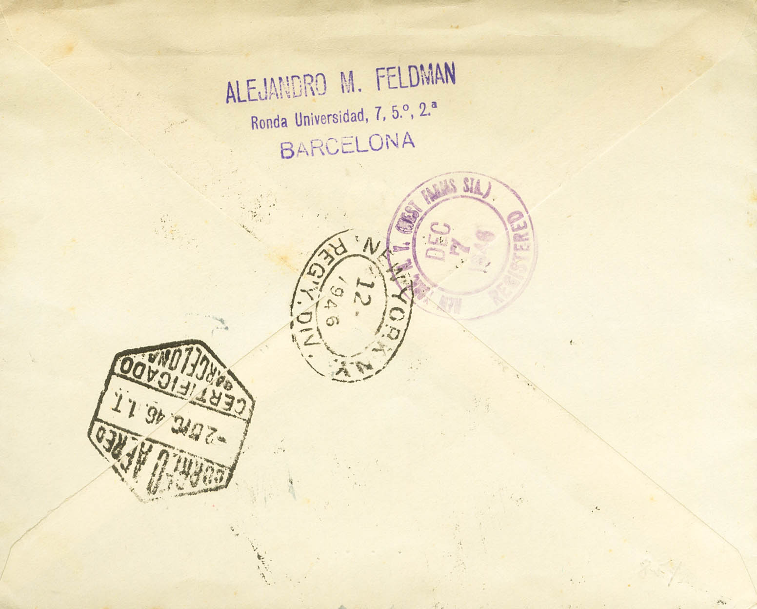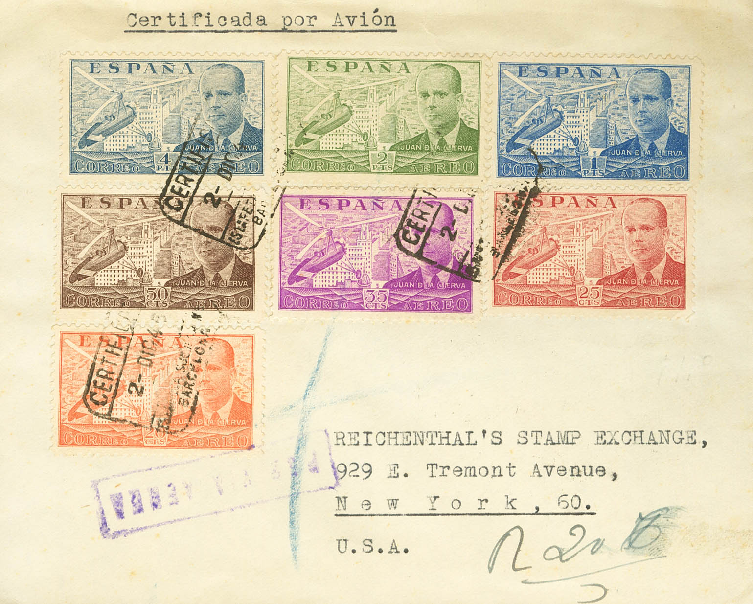 English 880/86. 1948. Complete series. Air Mail from BARCELONA to NEW YORK (UNITED STATES). On the back arrival. MAGNIFICENT.
