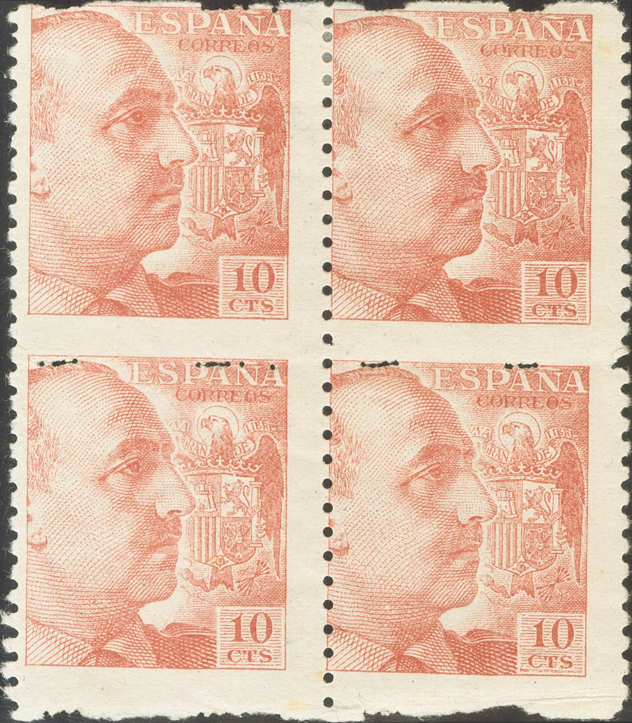 English ★★/★ 920(4). 1939. 10 cts chestnut orange, block of four. Variety IRREGULAR HORIZONTAL TOOTH. MAGNIFICENT.