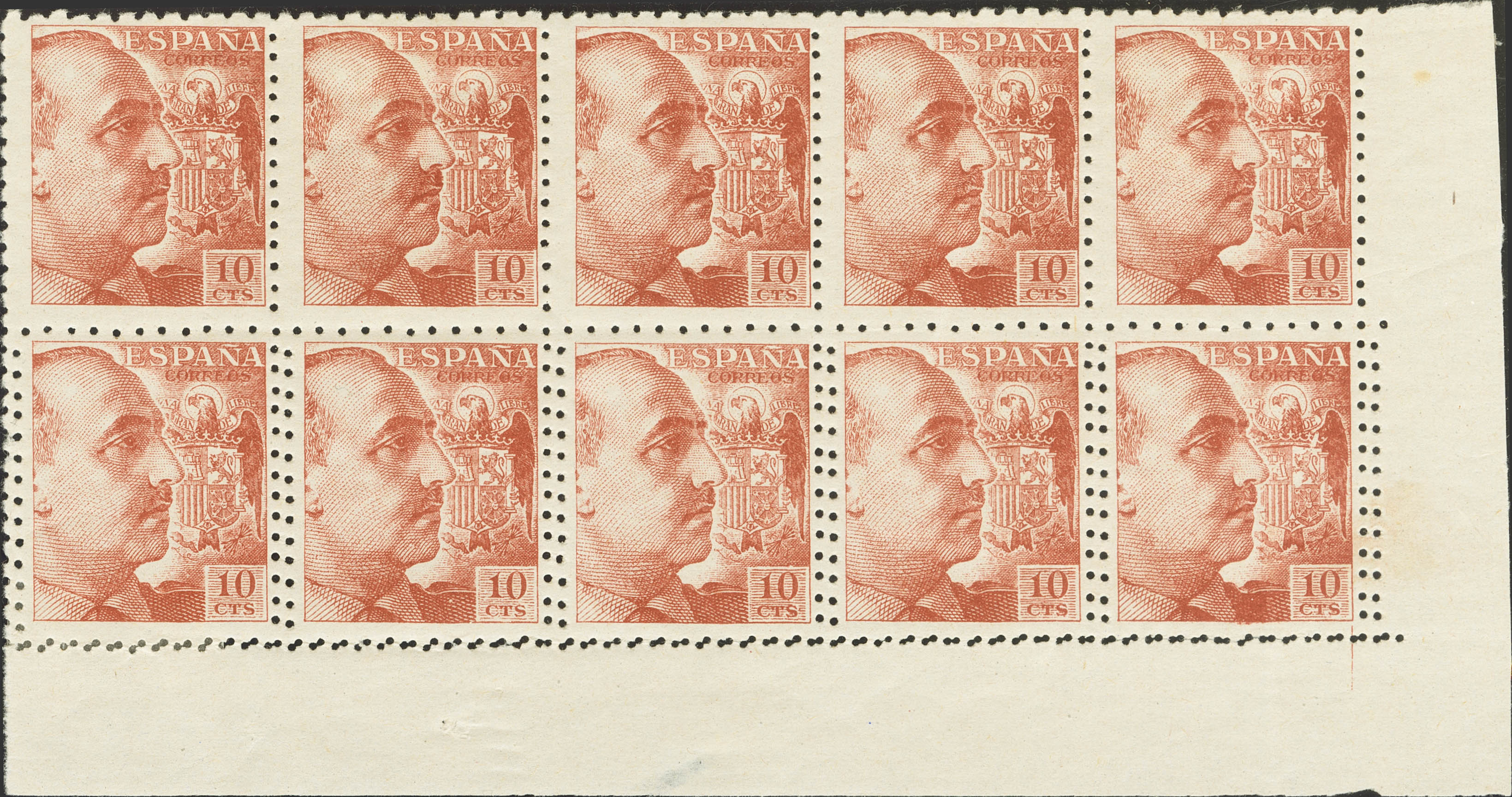 ★★/★ 920(5), 920dd(5). 1939. 10 cts brown orange, block of ten, sheet corner. DOUBLE TOOTHED variety lower seals. MAGNIFICENT AND VERY SPECTACULAR. Edifil 2021: ++220 Euros