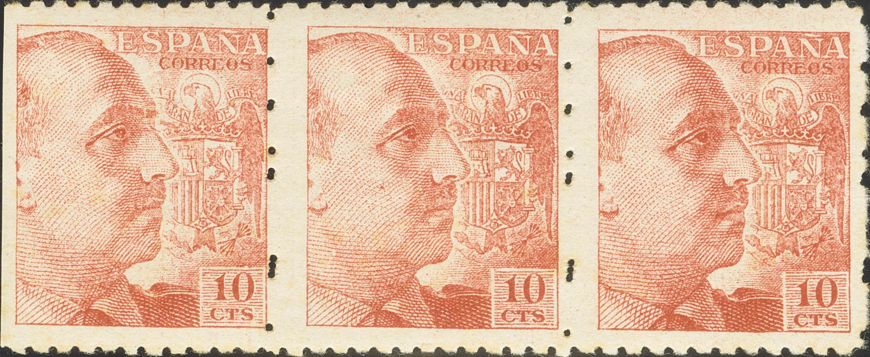 ★★/★ 920(3). 1939. 10 cts brown orange, strip of three stamps (usual condition). IRREGULAR VERTICAL TOOTH. PRETTY.