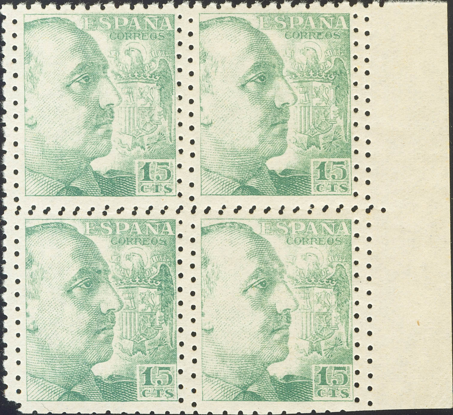 ★★ 921dd(4). 1939. 15 cts green yellow, block of four. DOUBLE TOOTH. MAGNIFICENT. Edifil 2021: ++164 Euros