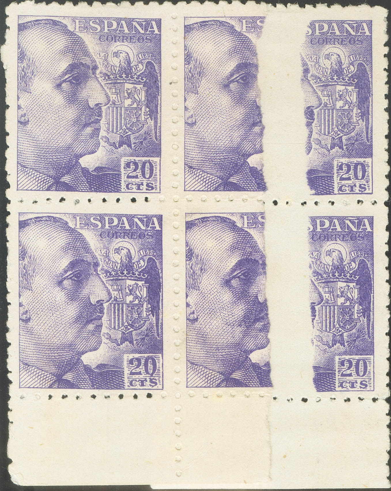(★) 922x(2). 1939. 20 cts violet, block of four. Two PAPER SPLICING variety stamps. MAGNIFICENT.