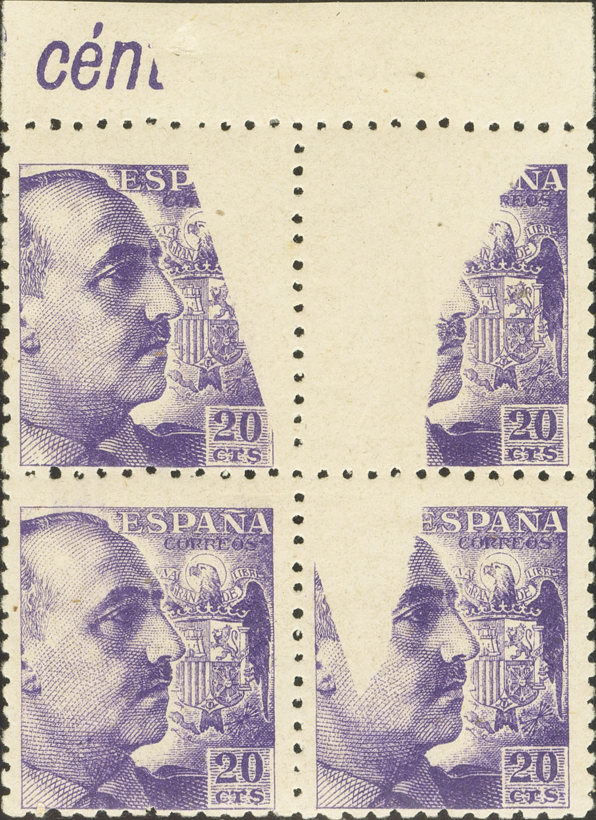 ★★ 922(4). 1939. 20 cts violet, block of four. Three PARTIAL PRINTING variety stamps, caused by the inclusion of paper. MAGNIFICENT.