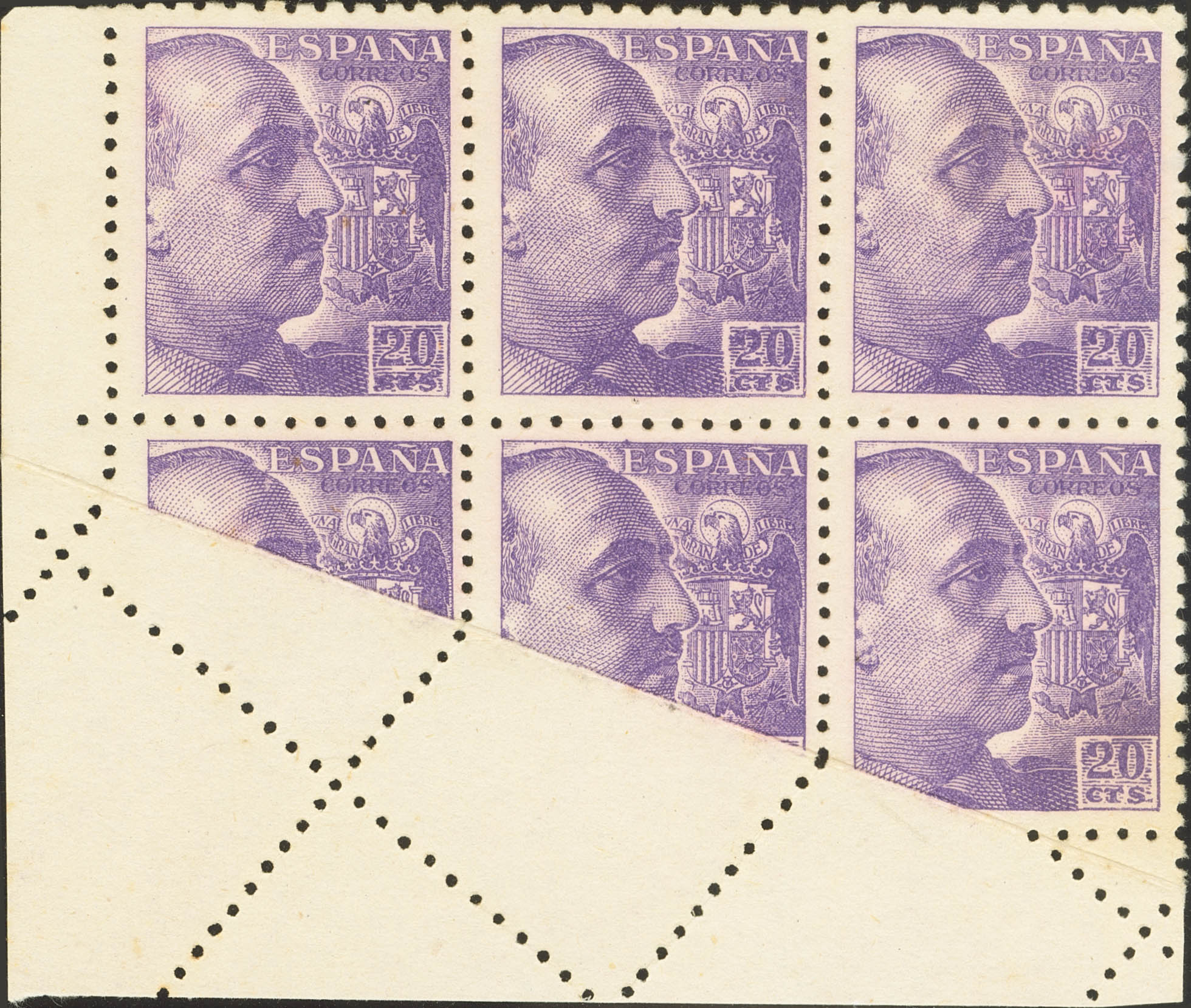 (★) 922(6). 1939. 20 cts violet, block of six. Three stamps PARTIAL IMPRESSION and DIAGONAL TOOTH, caused by folding of the paper. MAGNIFICENT.