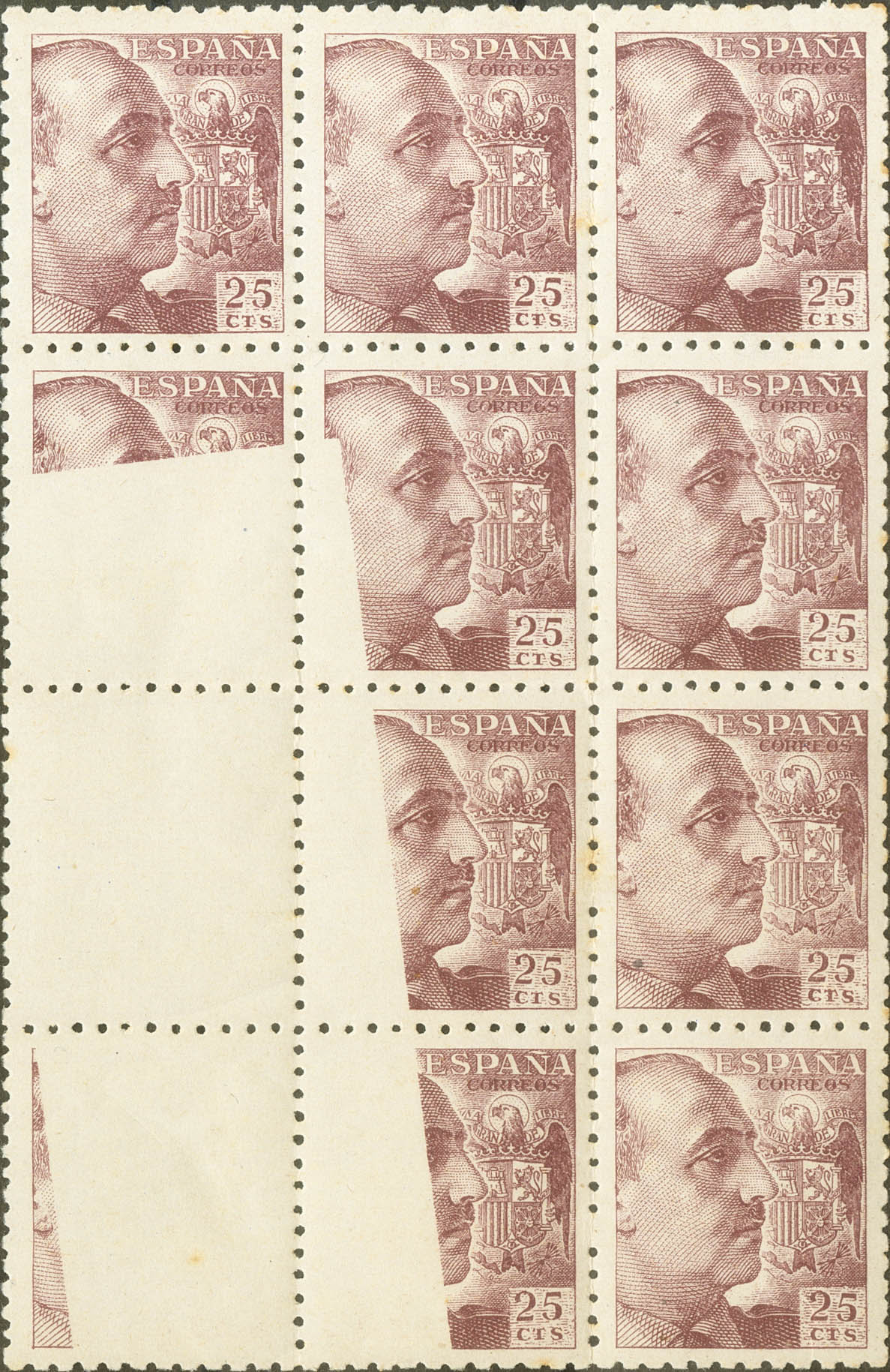★★/★ 923(12). 1939. 25 cts carmine lilac, block of twelve. Six PARTIAL IMPRESSION stamps, caused by inclusion of paper. MAGNIFICENT.