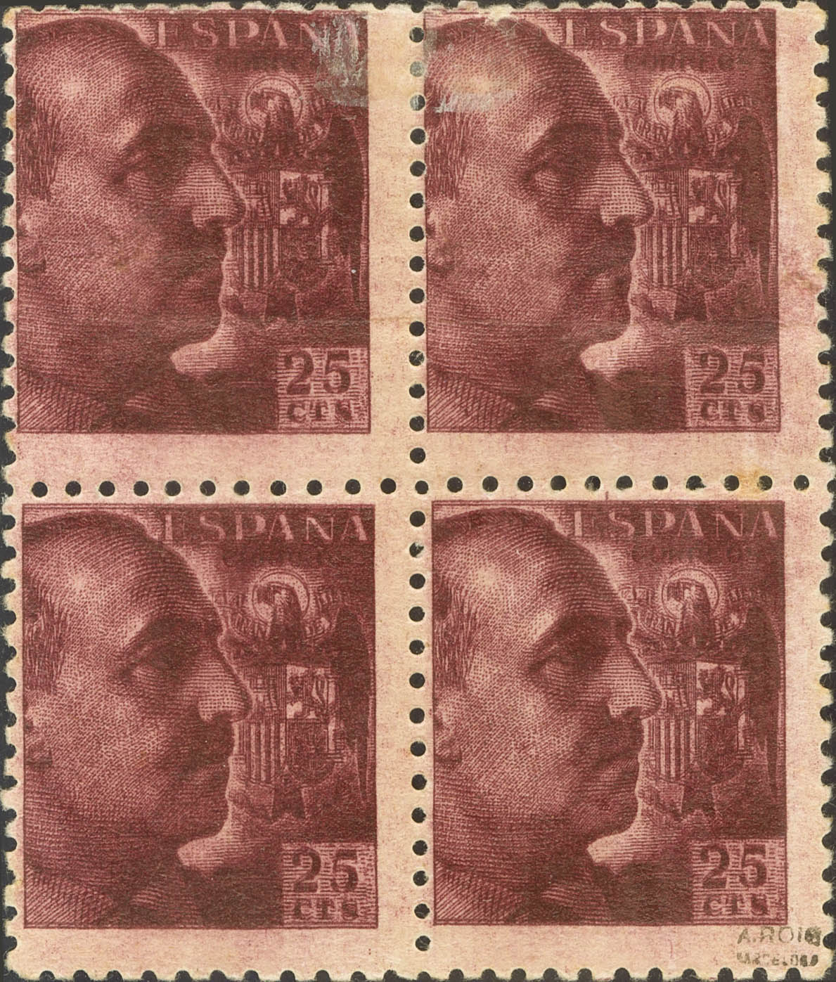 ★ 923eg(4). 1939. 25 cts dark lilac, block of four. PRINTED ON THE RUBBER SIDE. MAGNIFICENT.