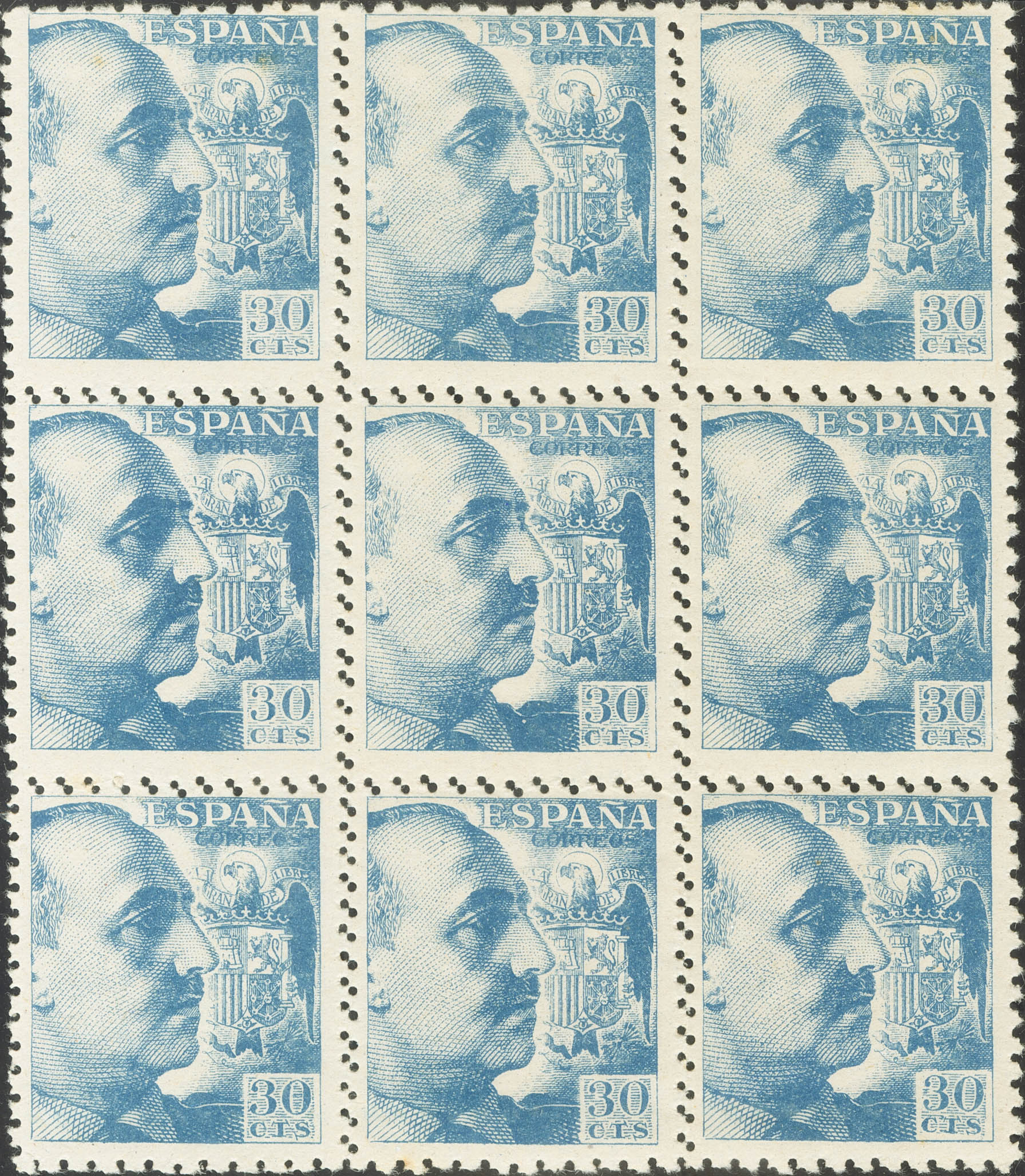 ★★/★ 924dd(9). 1939. 30 cts blue, block of nine. DOUBLE TOOTH. MAGNIFICENT AND RARE.