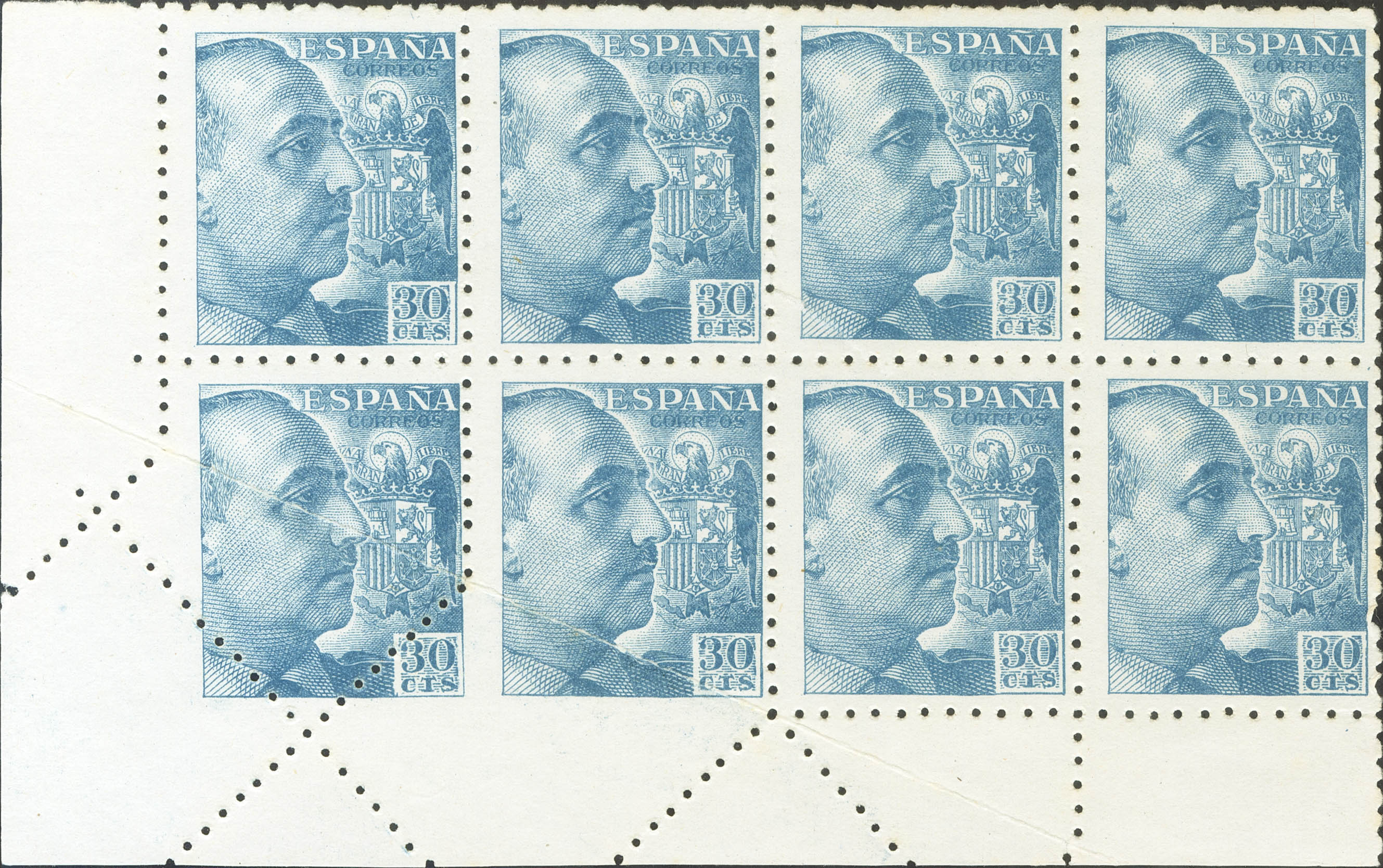(★) 924(8). 1939. 30 cts blue, block of eight, sheet corner. Two stamps PARTIAL DIAGONAL TOOTH, caused by folding of the paper. MAGNIFICENT.