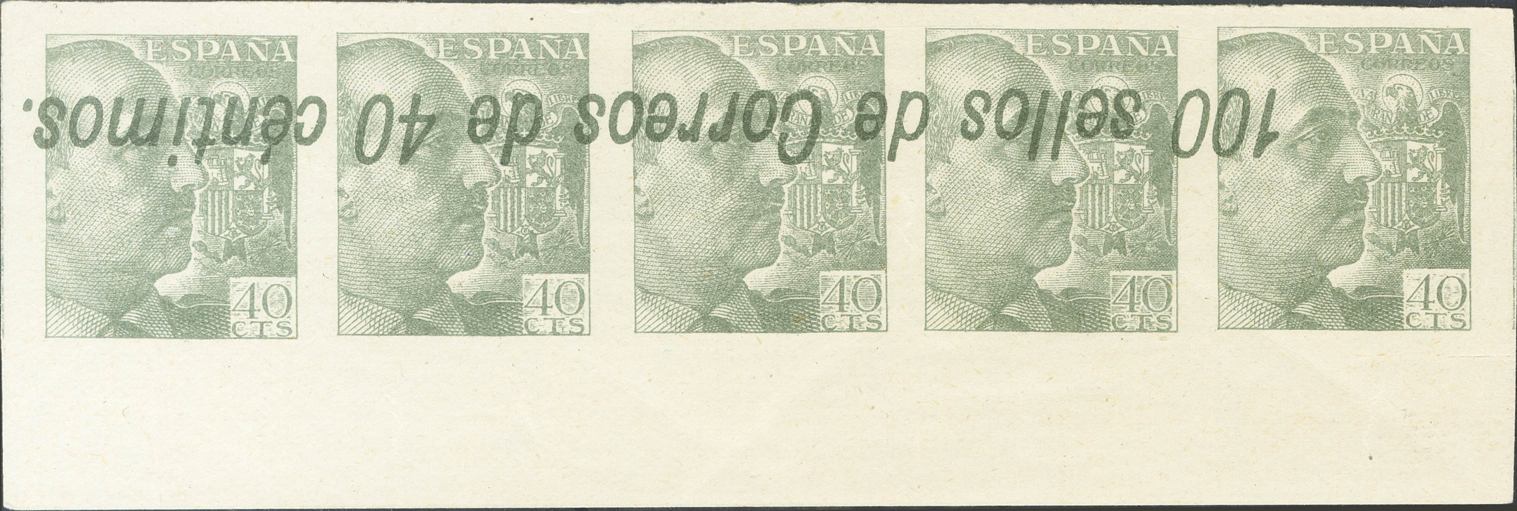 English ★★/★ 925s(5). 1939. 40 cts gray green, strip of five, leaf edge. Printed on sheet header of the same value and WITHOUT TOOTH. MAGNIFICENT.