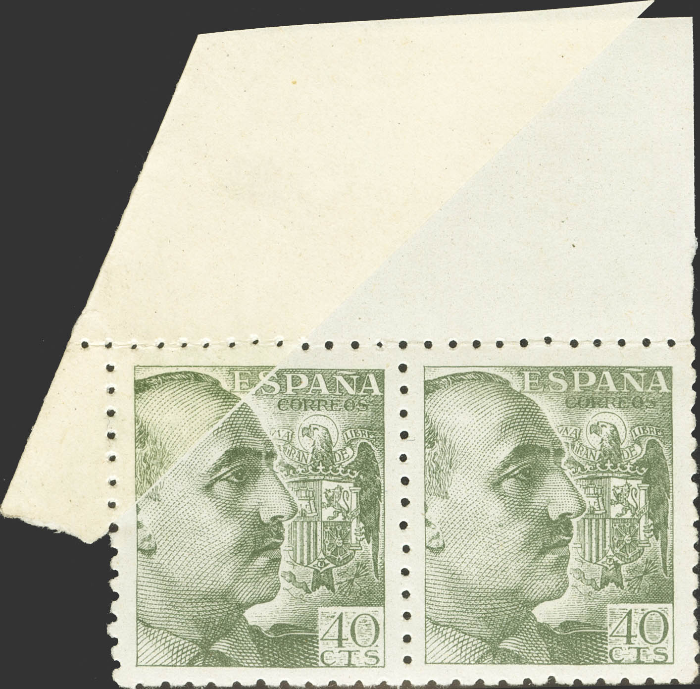 ★★ 925(2). 1939. 40 cts green gray, pair, sheet corner. A PARTIAL IMPRESSION stamp, caused by folding the paper. MAGNIFICENT.