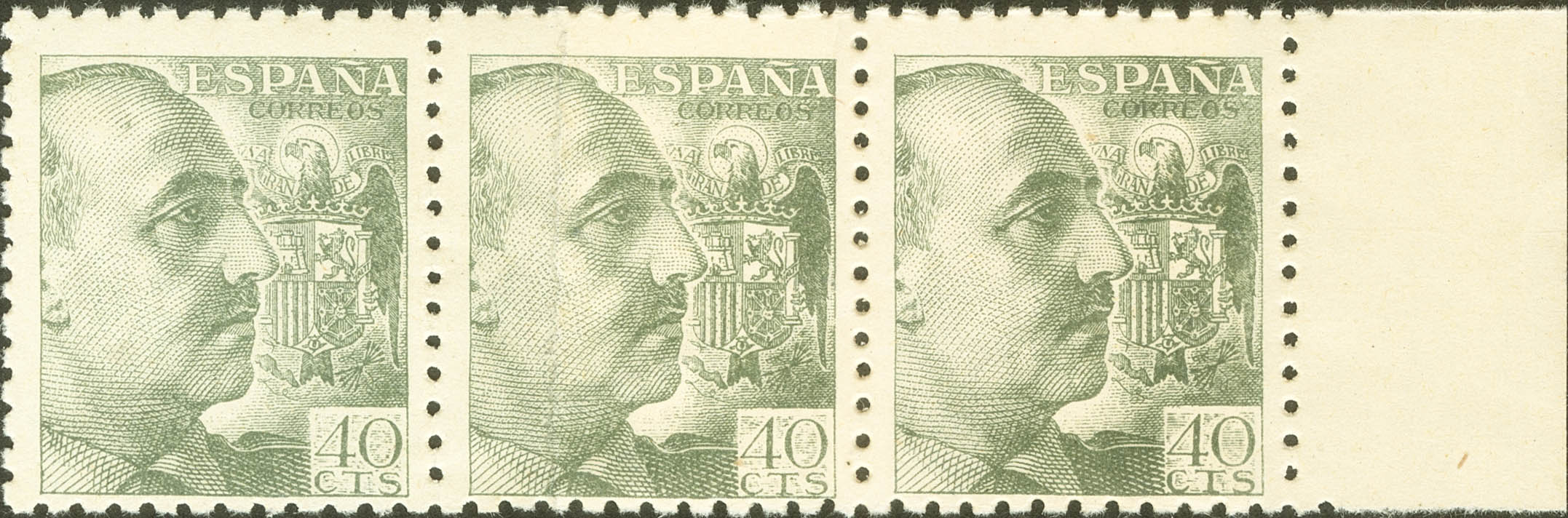 ★★ 925(2), 925x. 1939. 40 cts green gray, strip of three. A PAPER SPLICING variety stamp. MAGNIFICENT. Edifil 2021: +41 Euros