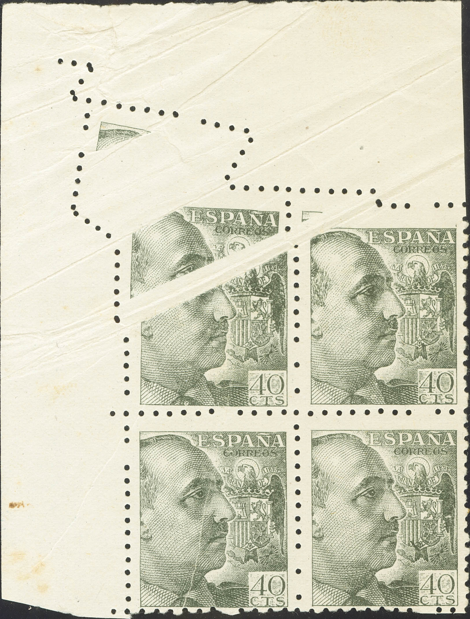 ★ 925(2), 925iw(2). 1939. 40 cts green gray, block of four, sheet corner. Two DIAGONAL PAPER BELLOWS stamps. MAGNIFICENT.