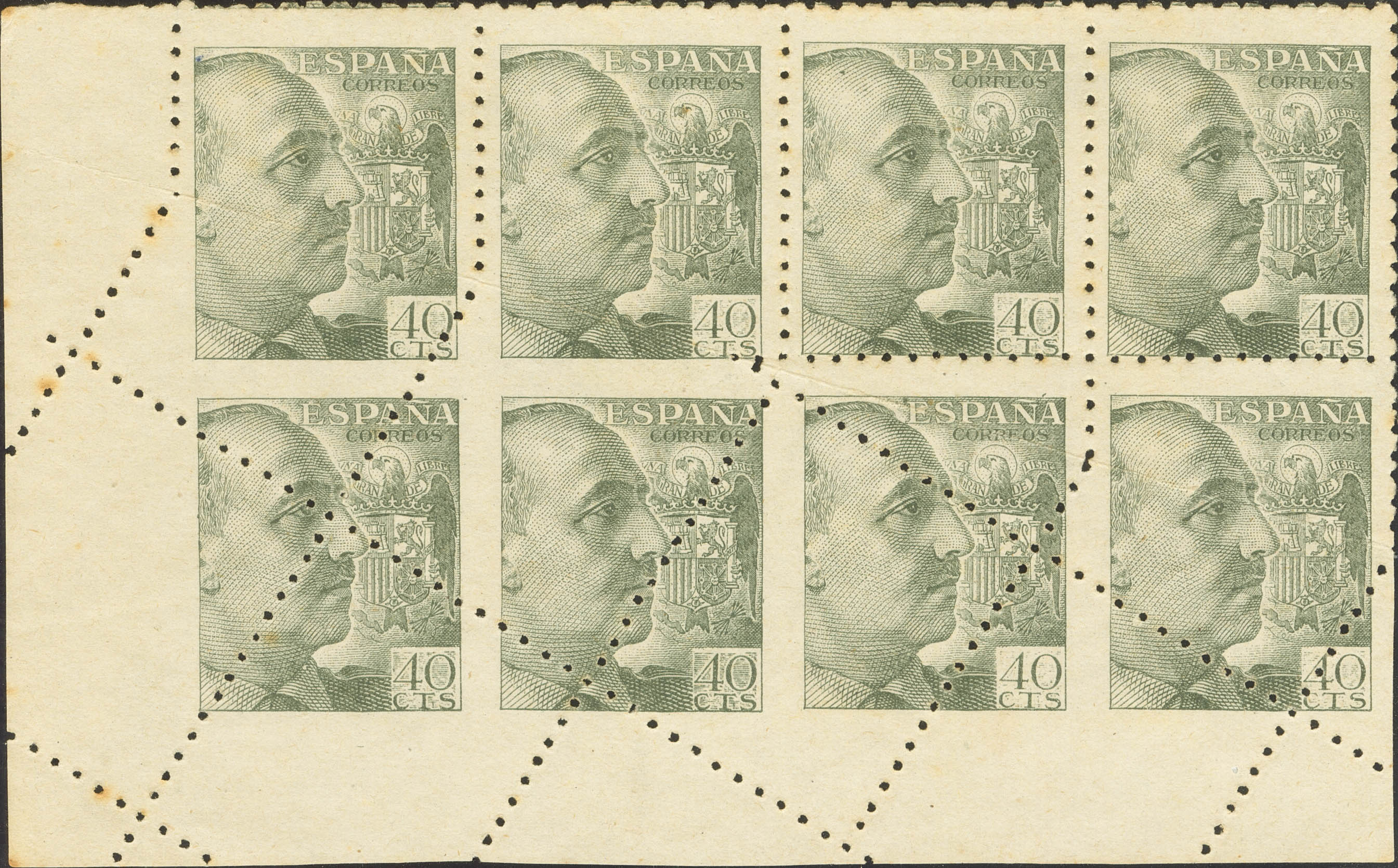 (★) 925(8). 1939. 40 cts green gray, block of eight, sheet corner (some stamp marks from time). Six DIAGONAL TOOTH stamps, caused by paper folding. PRETTY.