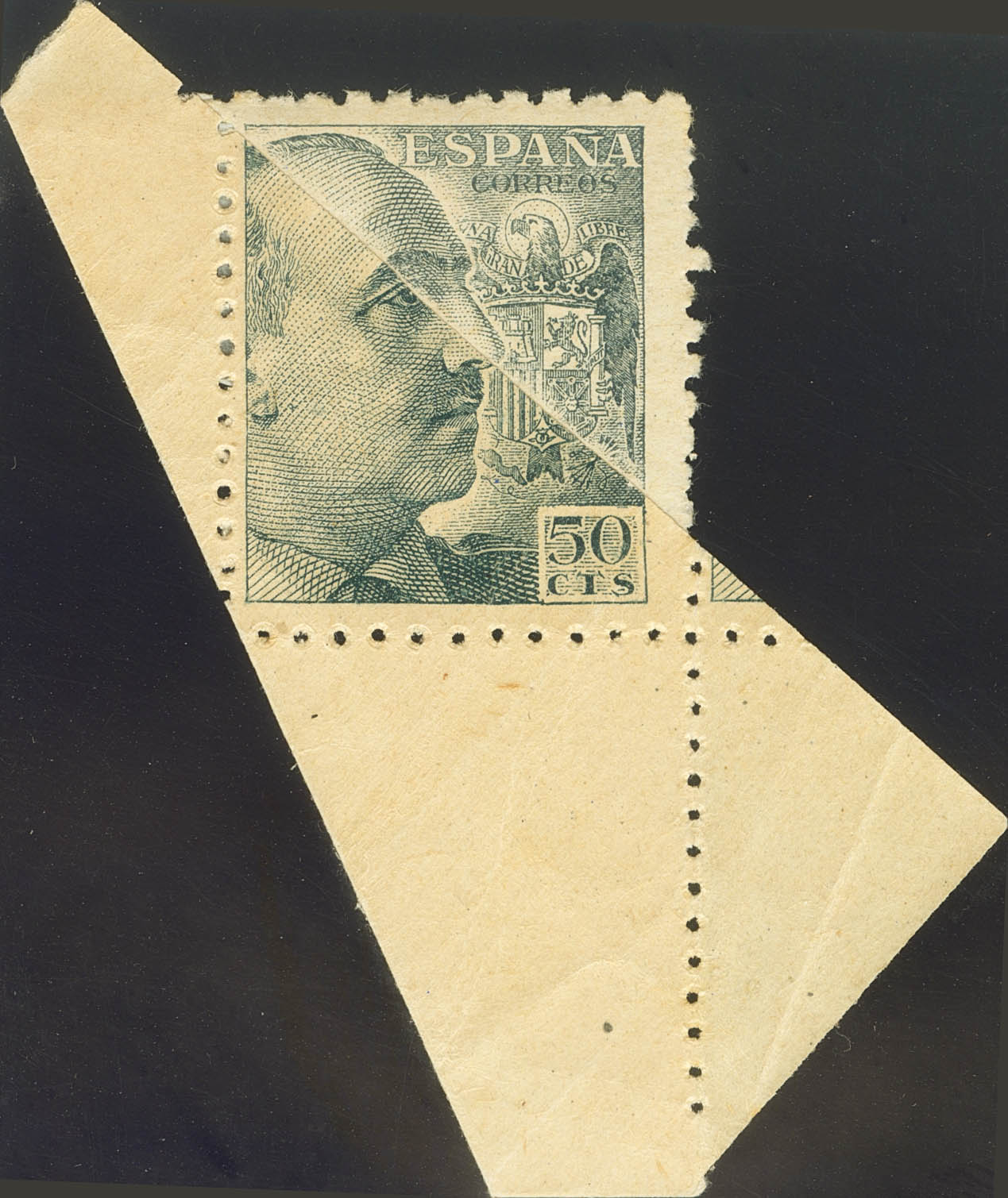 ★★ 927. 1939. 50 cts gray, sheet corner. PARTIAL PRINT ON THE REVERSE, caused by the folding of the paper. MAGNIFICENT AND SPECTACULAR VARIETY.