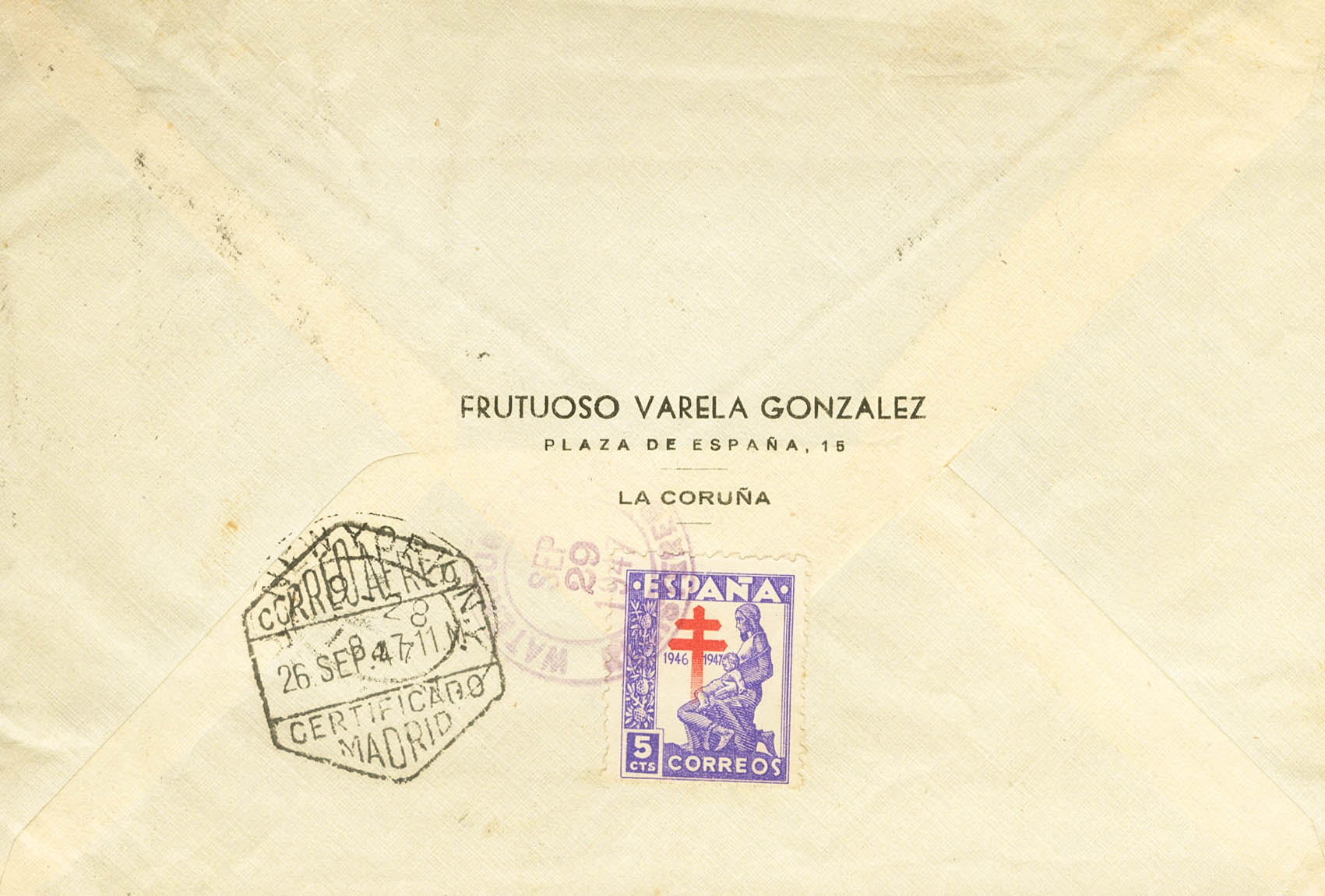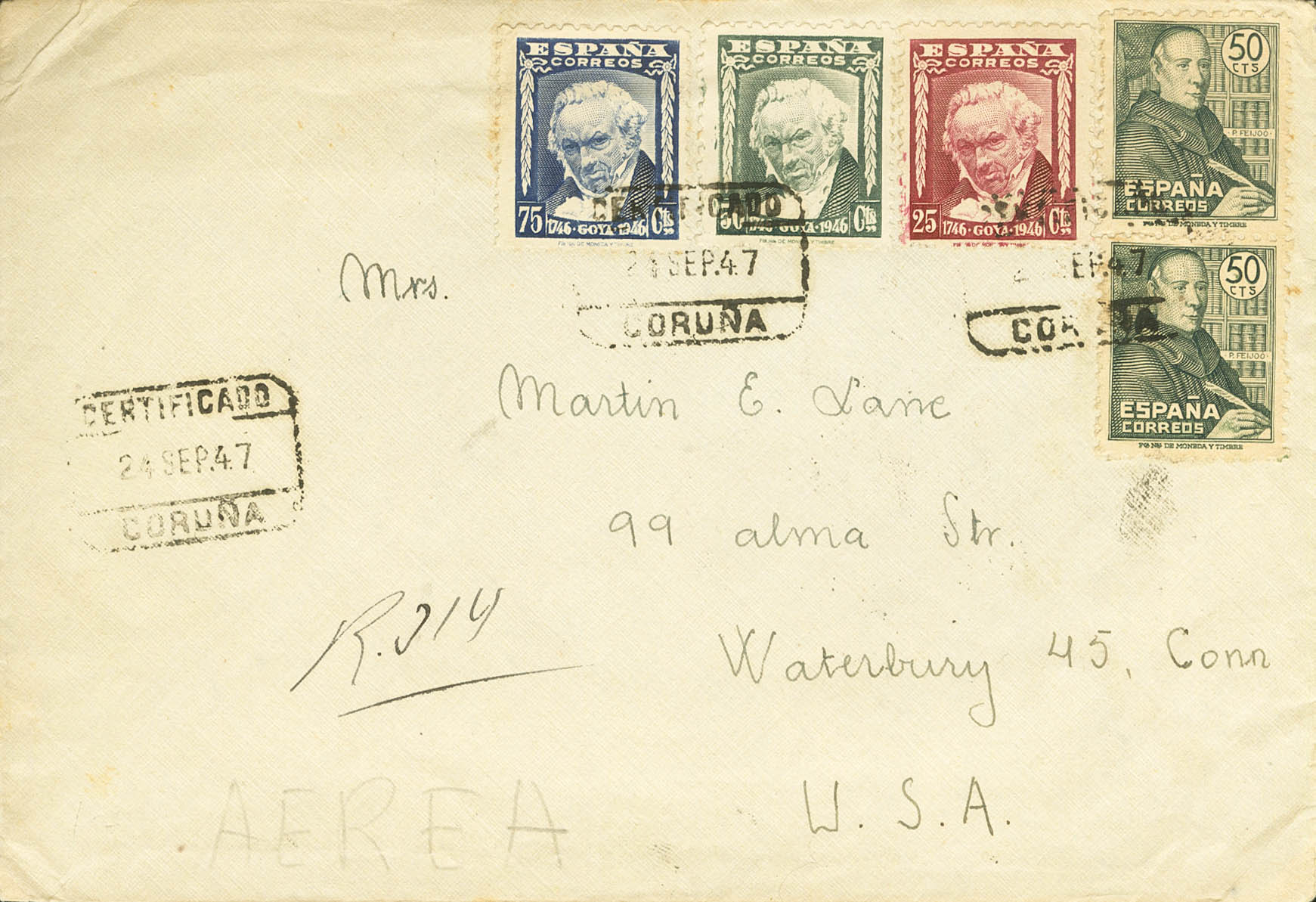 1005/07, 1011(2). 1947. Complete series and 50 cts green, pair. Certificate from CORUÑA to WATERBURY (UNITED STATES). CERTIFIED postmark / CORUÑA, on the back of arrival and also a stamp of 5 protuberculous cts. MAGNIFICENT.