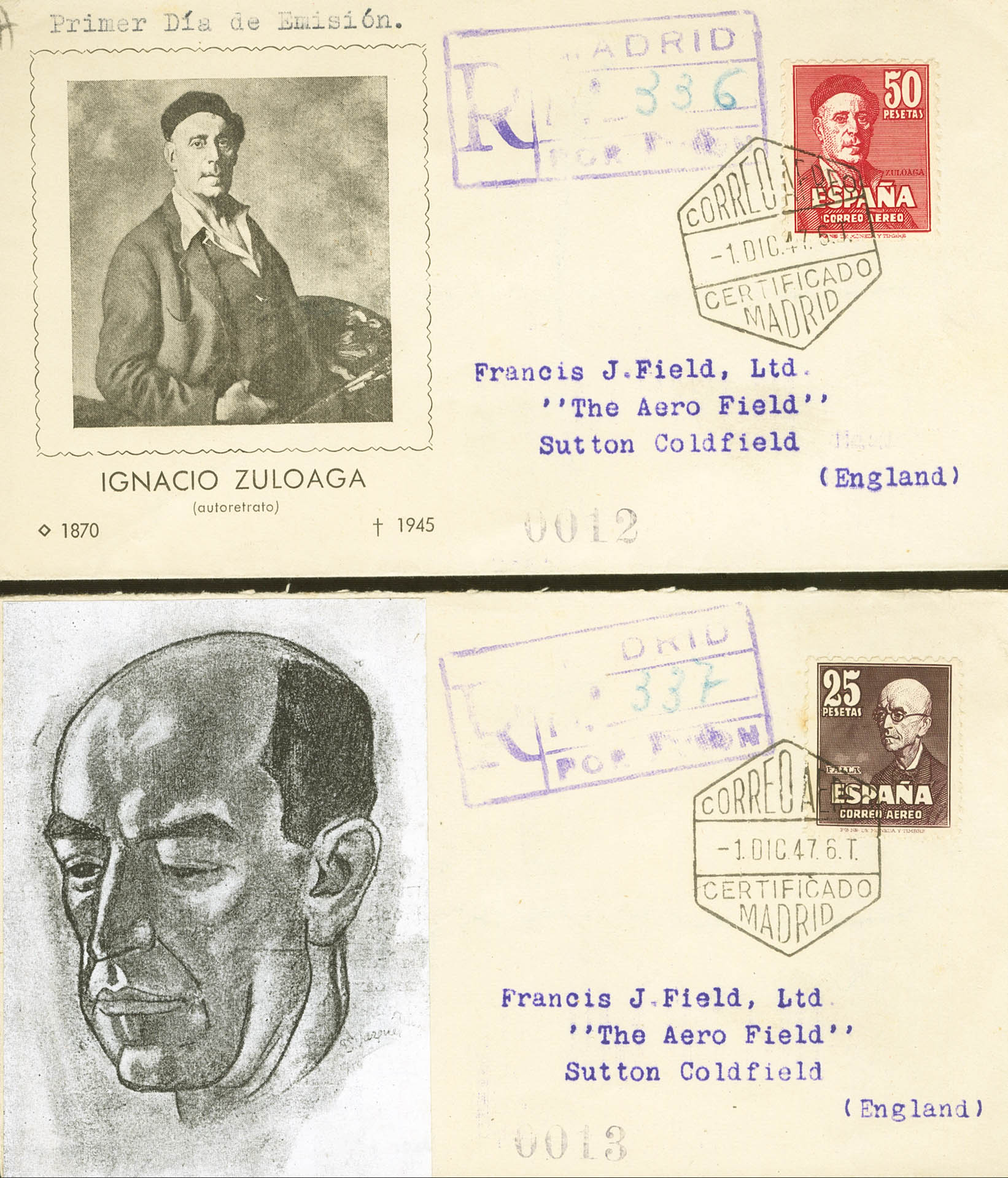 1015/16. 1947. Complete series. First Day Covers (the Falla envelope has a photocopy with Manuel de Falla's face attached covering Zuloaga's drawing). MAGNIFICENT. Edifil 2024: 415 Euros