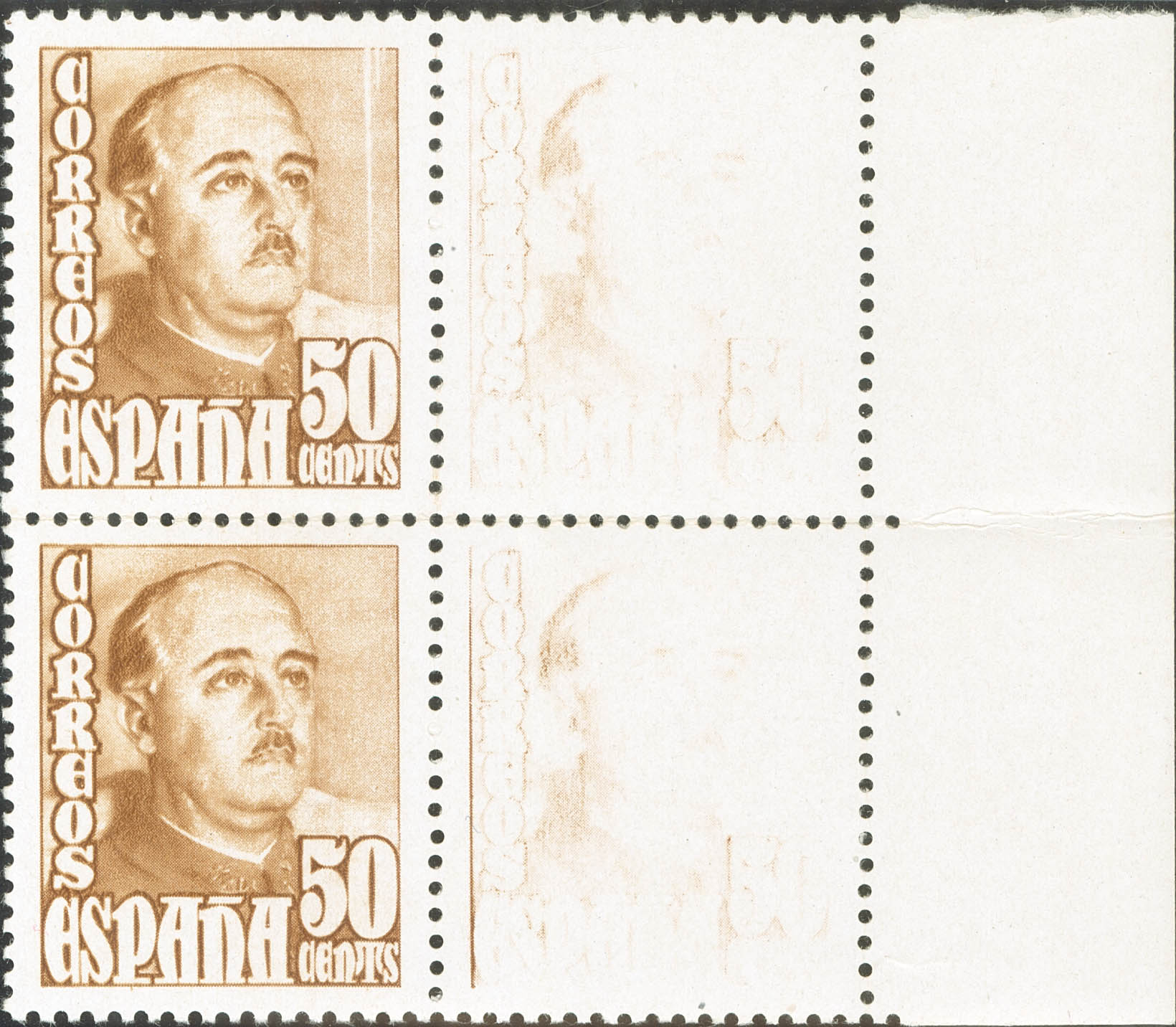 ★★ 1022(4). 1948. 50 cts yellow chestnut, block of four. Two DILUTED IMPRESSION stamps. MAGNIFICENT AND RARE.