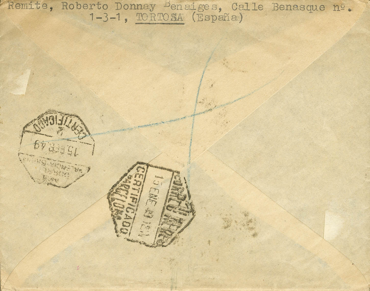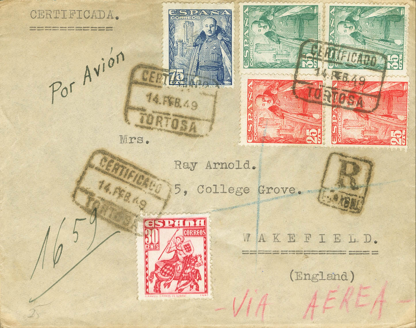 1024(2), 1026(2), 1031, 1034. 1949. 25 cts red, pair, 35 cts green, pair, 75 cts blue and 30 cts red. Certificate from TORTOSA (TARRAGONA) to WAKEFIELD (UNITED KINGDOM). CERTIFIED postmark / TORTOSA, on the back transits. MAGNIFICENT.