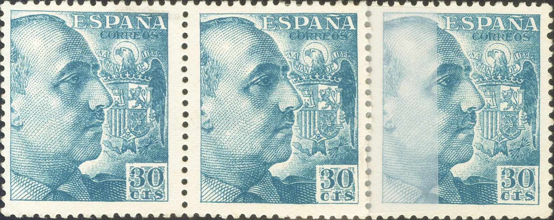 (★) 1049x(3). 1949. 30 cts dark blue, strip of three. Variety by PAPER SPLICING. MAGNIFICENT.