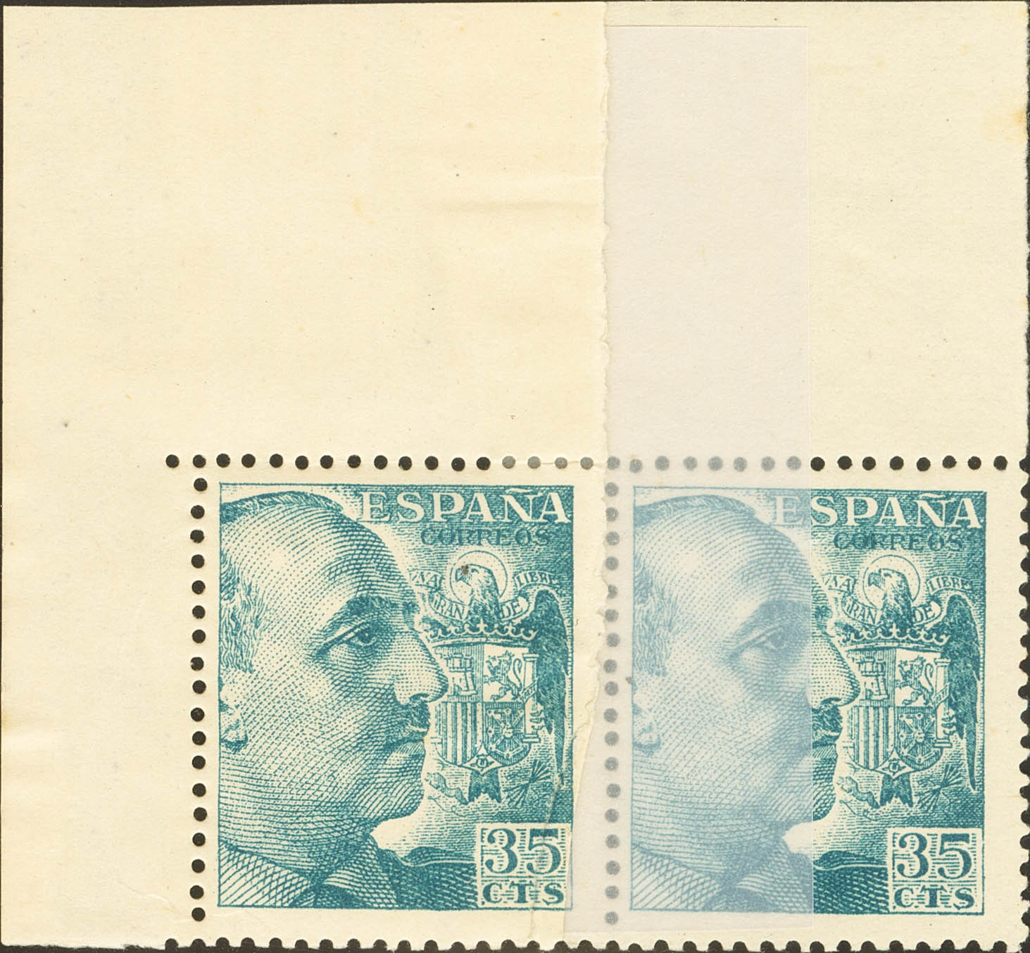 ★ 1050x(2). 1949. 35 cts turquoise blue, pair, corner of sheet. Variety by PAPER SPLICING. MAGNIFICENT.