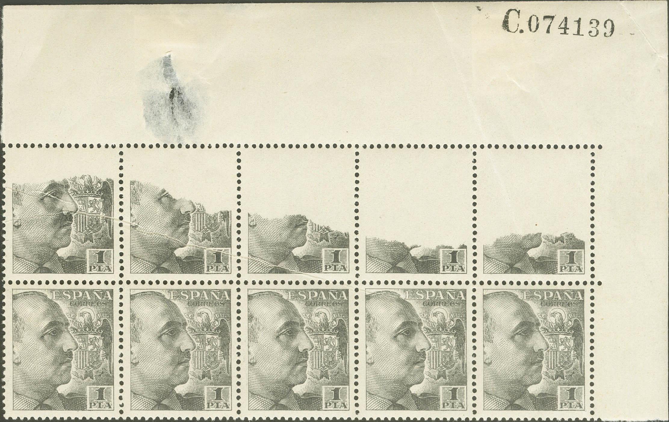 ★★/★ 1056(10). 1949. 1 sts black, block of ten (thinning that does not affect the stamps and some folds). Four PARTIAL PRINTING variety stamps, caused by the inclusion of paper. MAGNIFICENT AND RARE BLOCK.