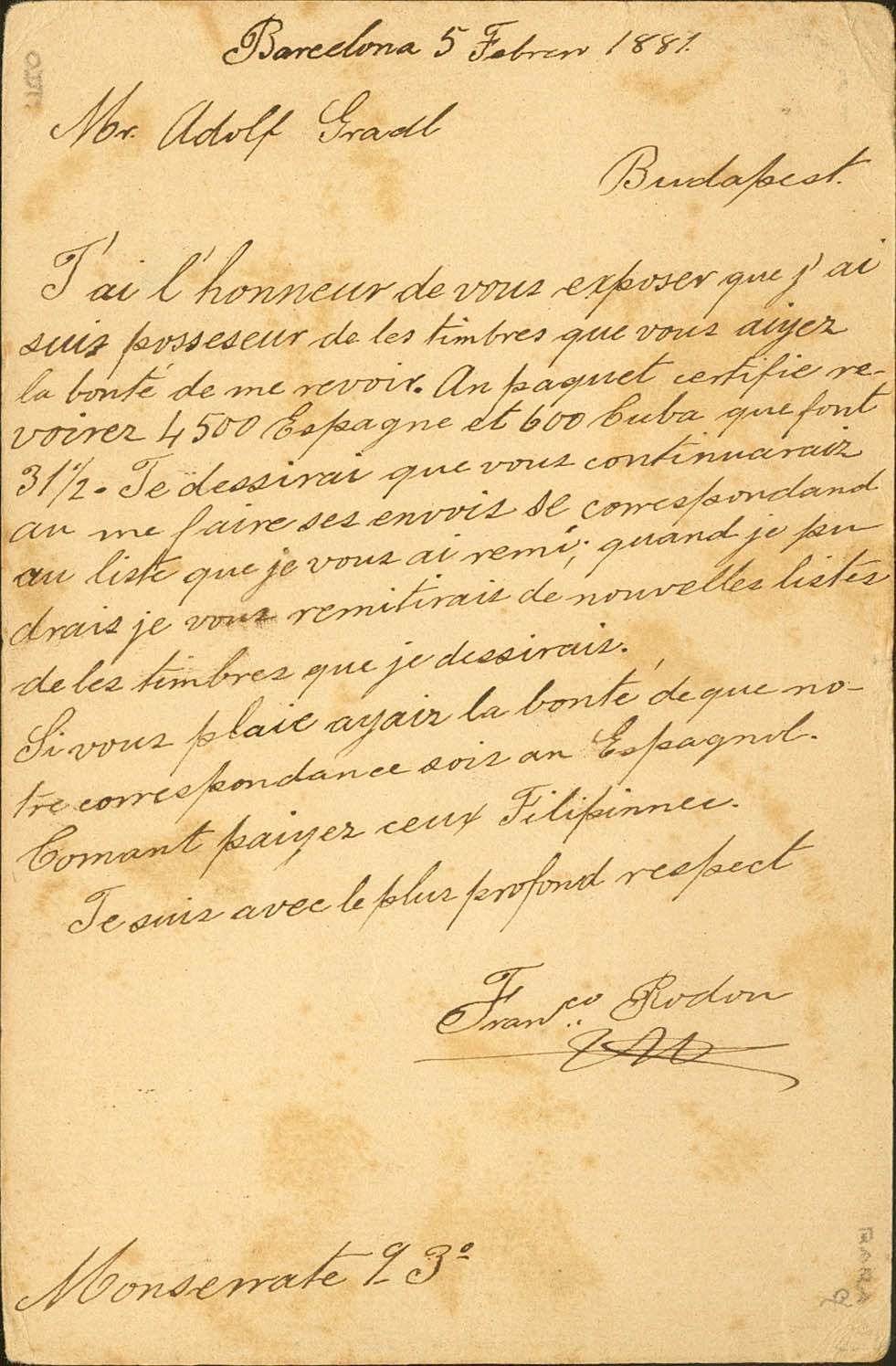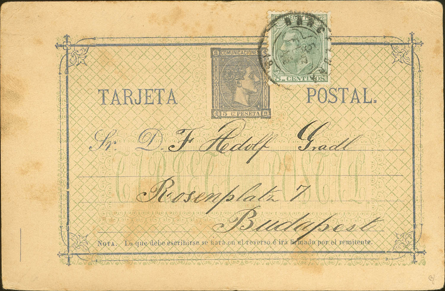 EP8. 1881. 5 cts overseas on Postal Card from BARCELONA to BUDAPEST (HUNGARY), with complementary postage of 5 cts green. MAGNIFICENT AND RARE DESTINATION.