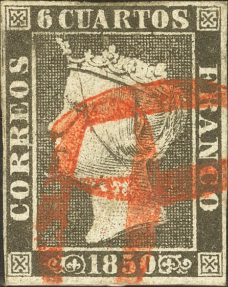 English 1. 1850. 6 cuartos black (I-14). Shipping postmark "O", in Zafra red (stamped twice as is customary in this town). MAGNIFICENT AND RARE. Cert. GRAUS.