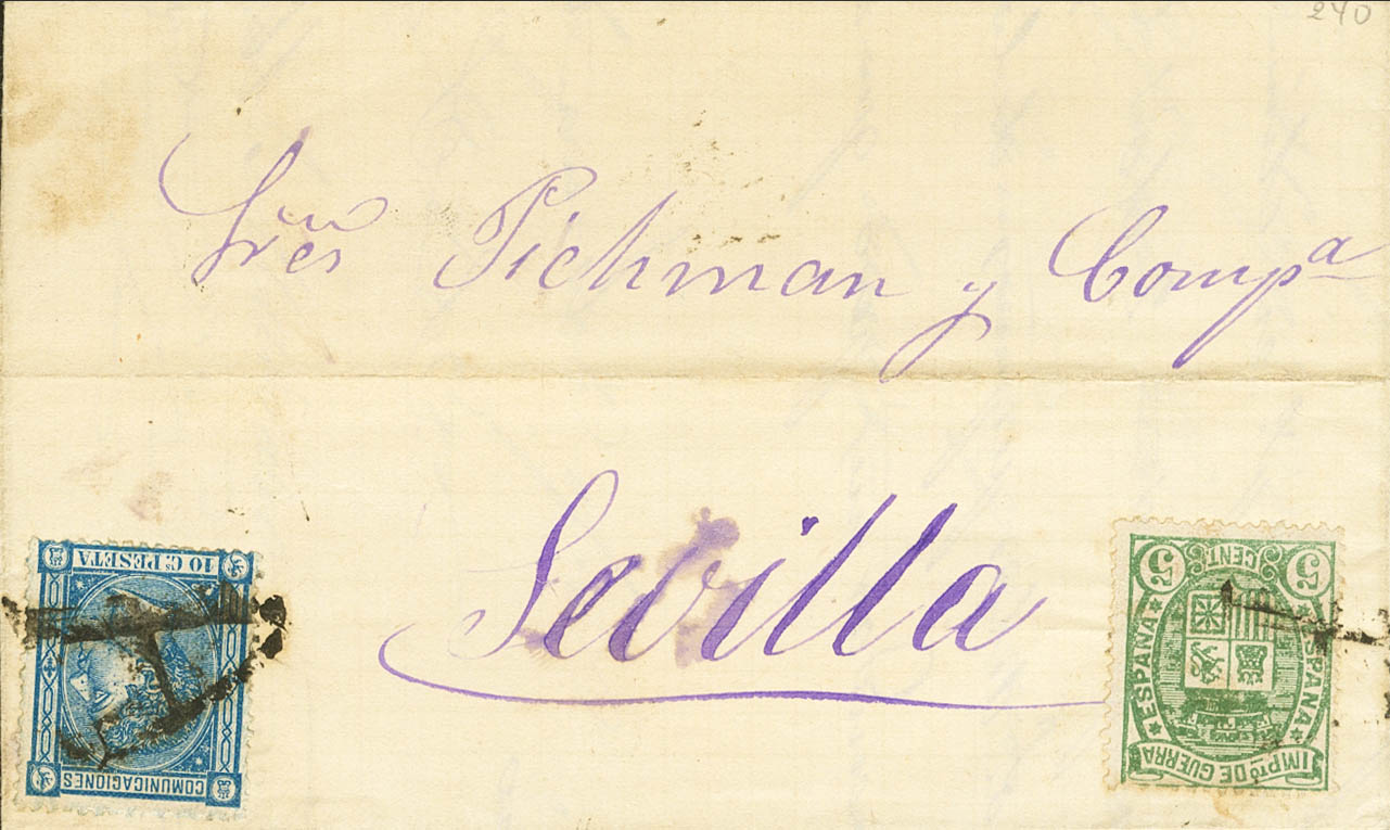 164, 154. 1875. 10 cts blue and 5 cts green. HARO (LA RIOJA) to SEVILLE. Subscription postmark "A", in black from Haro. MAGNIFICENT AND RARE.