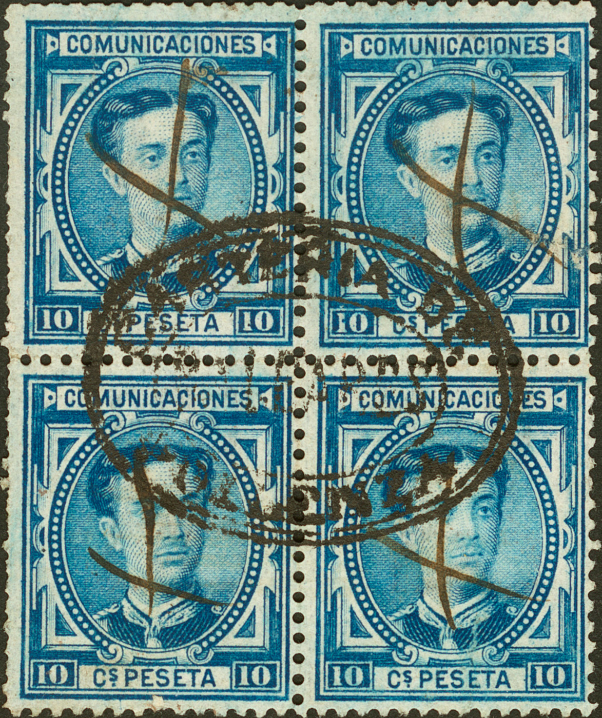 English 175(4). 1876. 10 cts blue, block of four. Postmark CARTERIA DE / BALEARIC ISLANDS / POLLENZA and disabling with pen. MAGNIFICENT AND RARE.