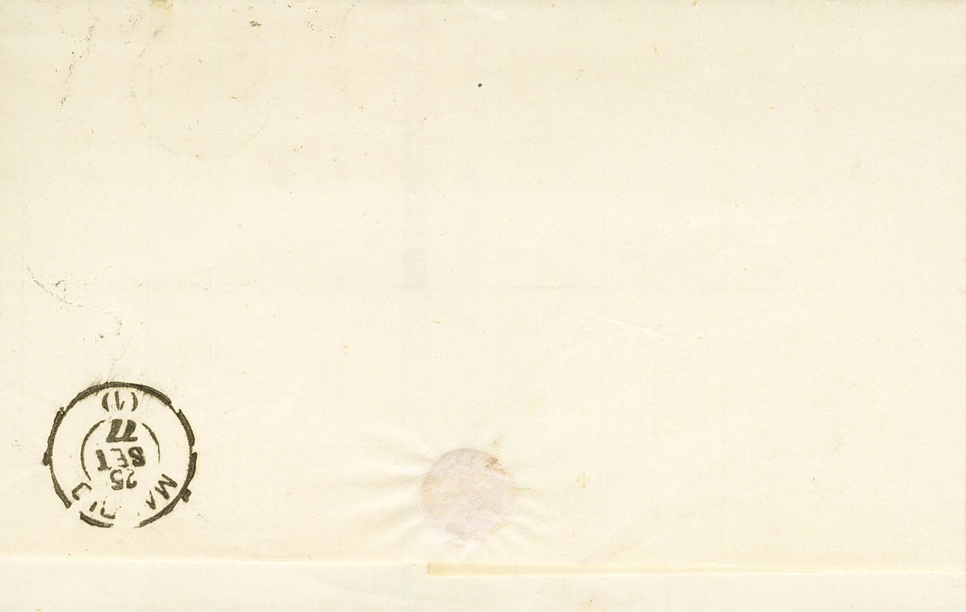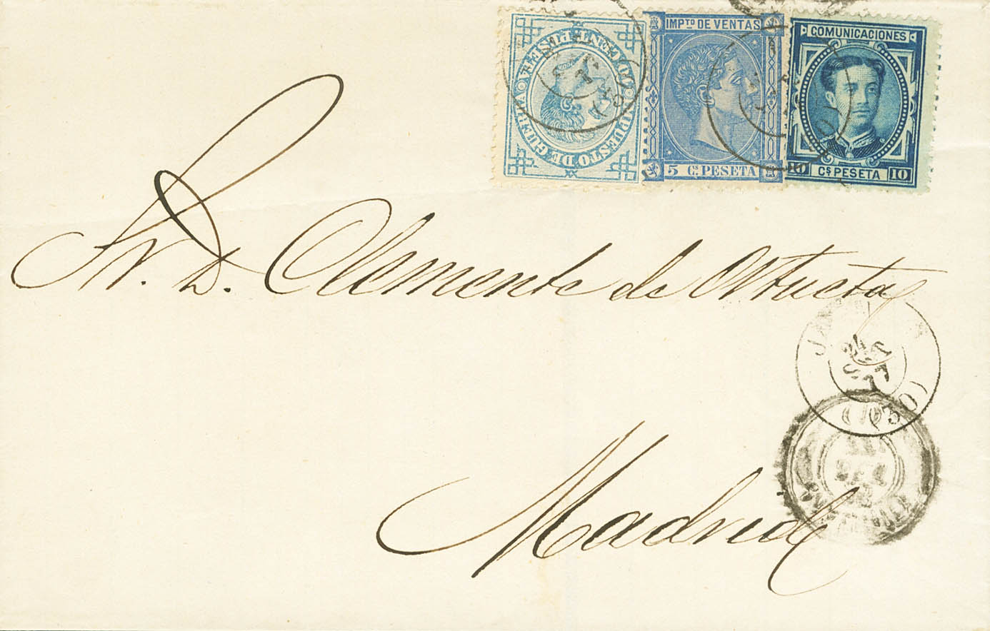 175. 1877. 10 cts blue, 10 cts blue War Tax and 5 cts blue Sales Tax. JAEN to MADRID. MAGNIFICENT AND SPECTACULAR AND RARE POSTAGE WITH A TAX STAMP.