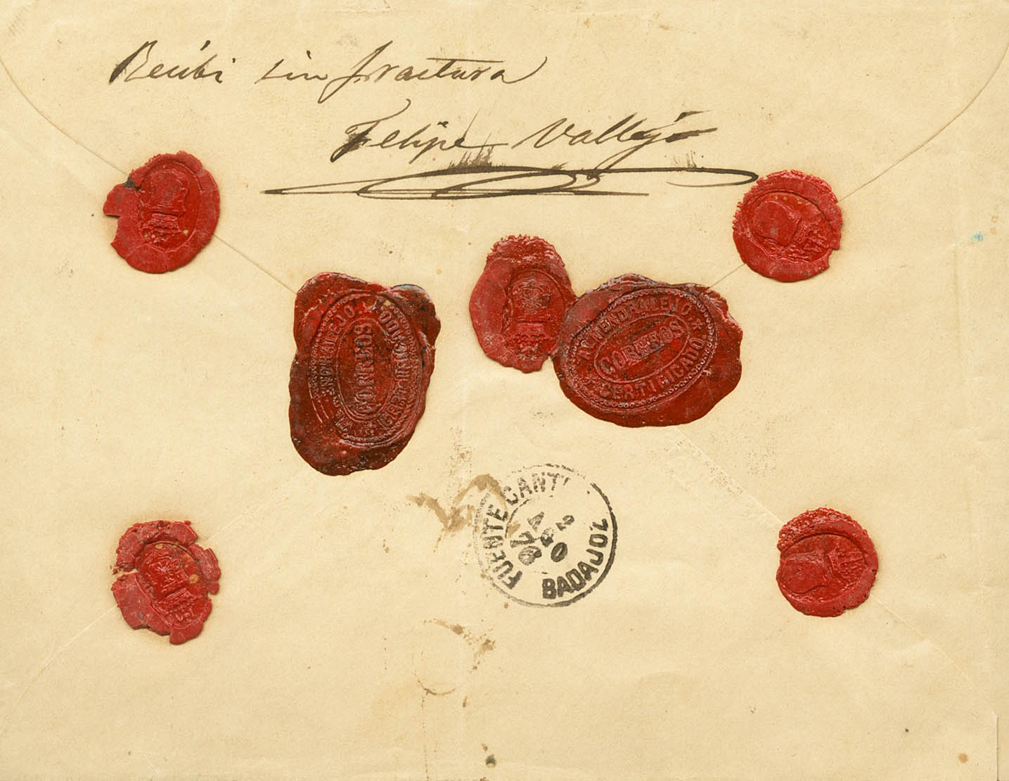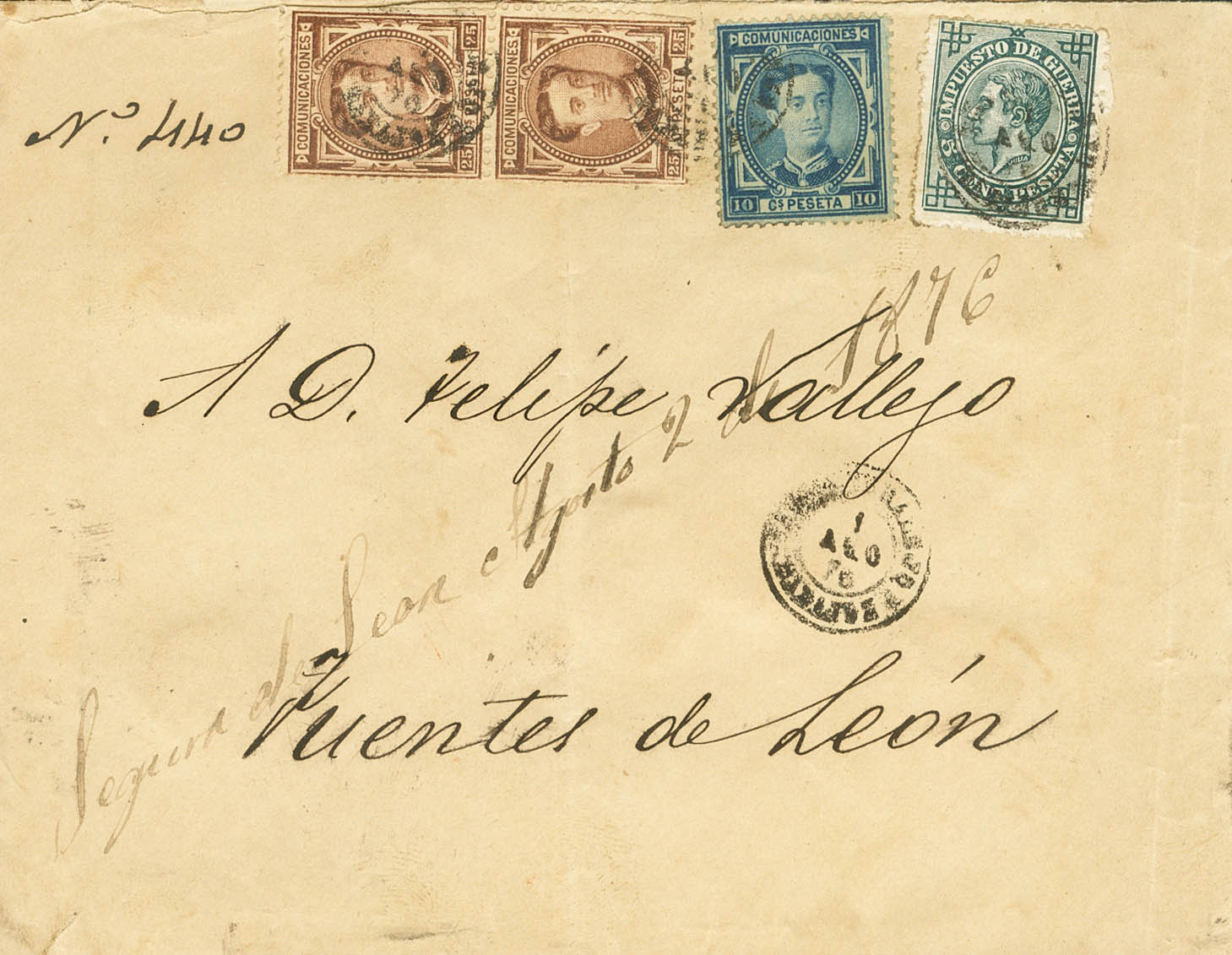 175, 177(2), 183. 1876. 10 cts blue, 25 cts chestnut red, two seals and 5 cts green. Certificate from ALMENDRALEJO to FUENTES DE LEON (BADAJOZ). Certificate No., certificate "Segura de León, August 2, 1876" and on the back handwritten acknowledgment of receipt and seals of the Almendralejo certificate. MAGNIFICENT AND VERY RARE.