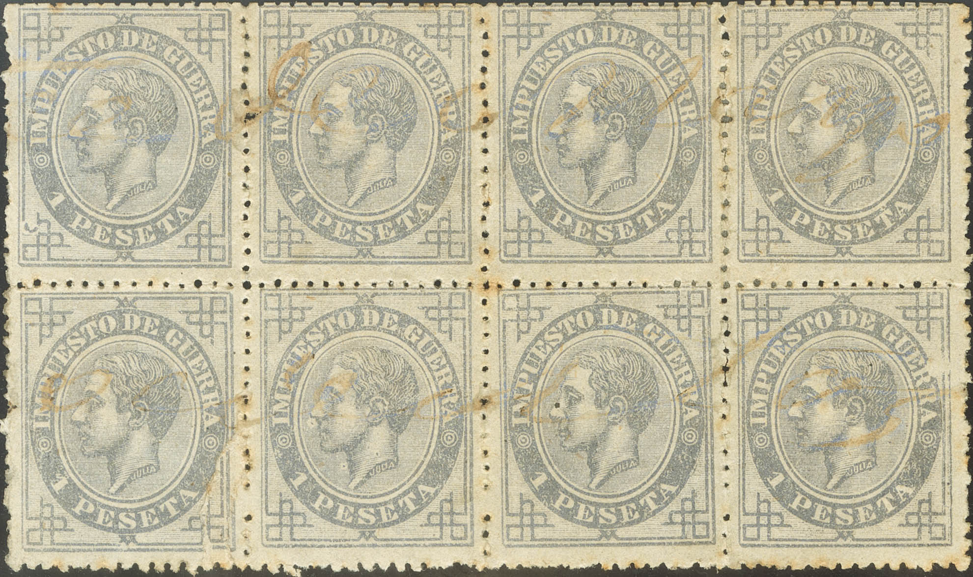 186(8). 1876. 1 sts lilac gray, block of eight. Unusable pen (tax use, diluted ink). BEAUTIFUL AND VERY RARE BLOCK.
