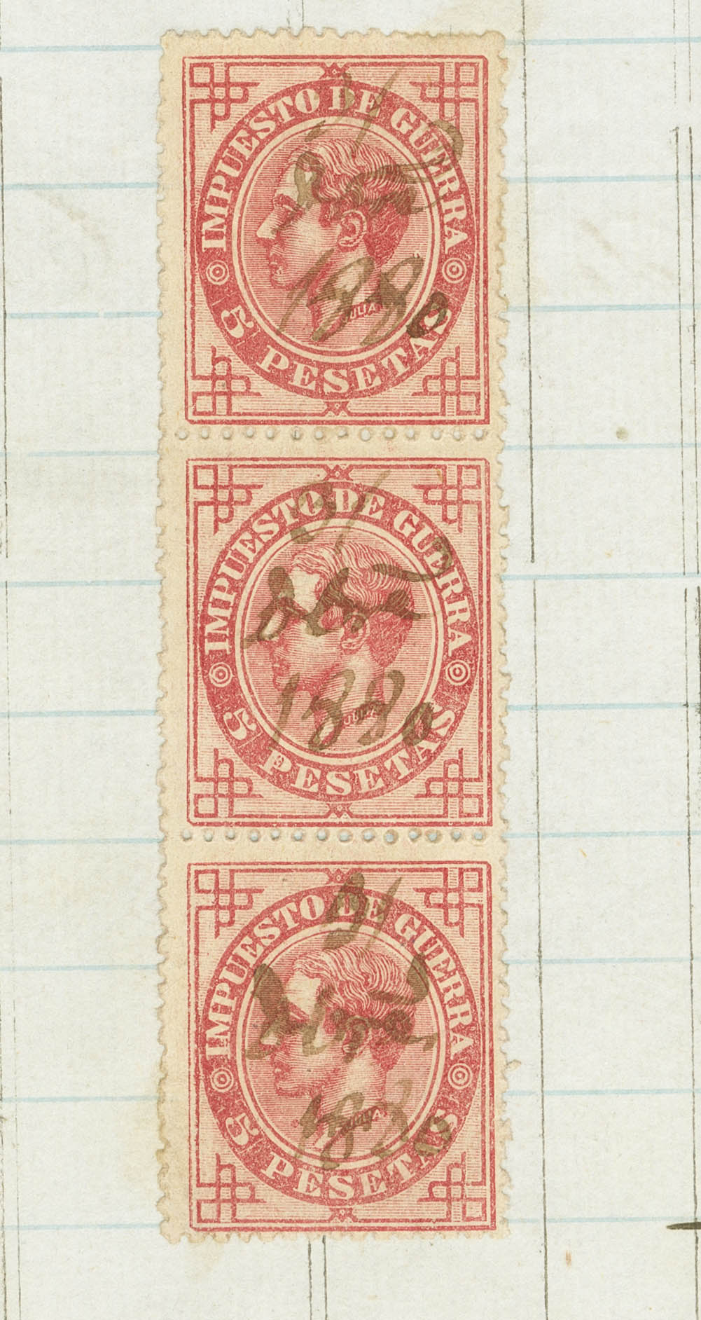 English 187(3). 1876. 5 sts pink, strip of three. Unusable with a pen (tax use). MAGNIFICENT AND VERY RARE MULTIPLE.