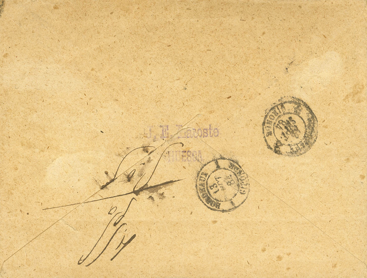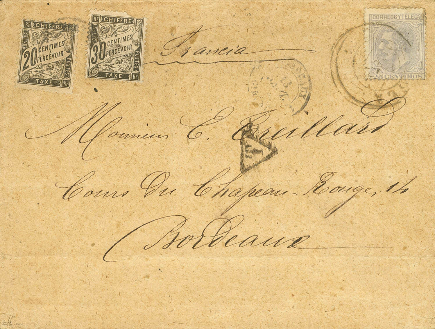 English 204. 1884. 25 cts blue gray. HUESCA to BORDEAUX (FRANCE). Appraised upon arrival at 50 cts (double postage), applying two French tax stamps of 20 cts and 30 cts (the 30 cts defect of origin). MAGNIFICENT AND VERY RARE.