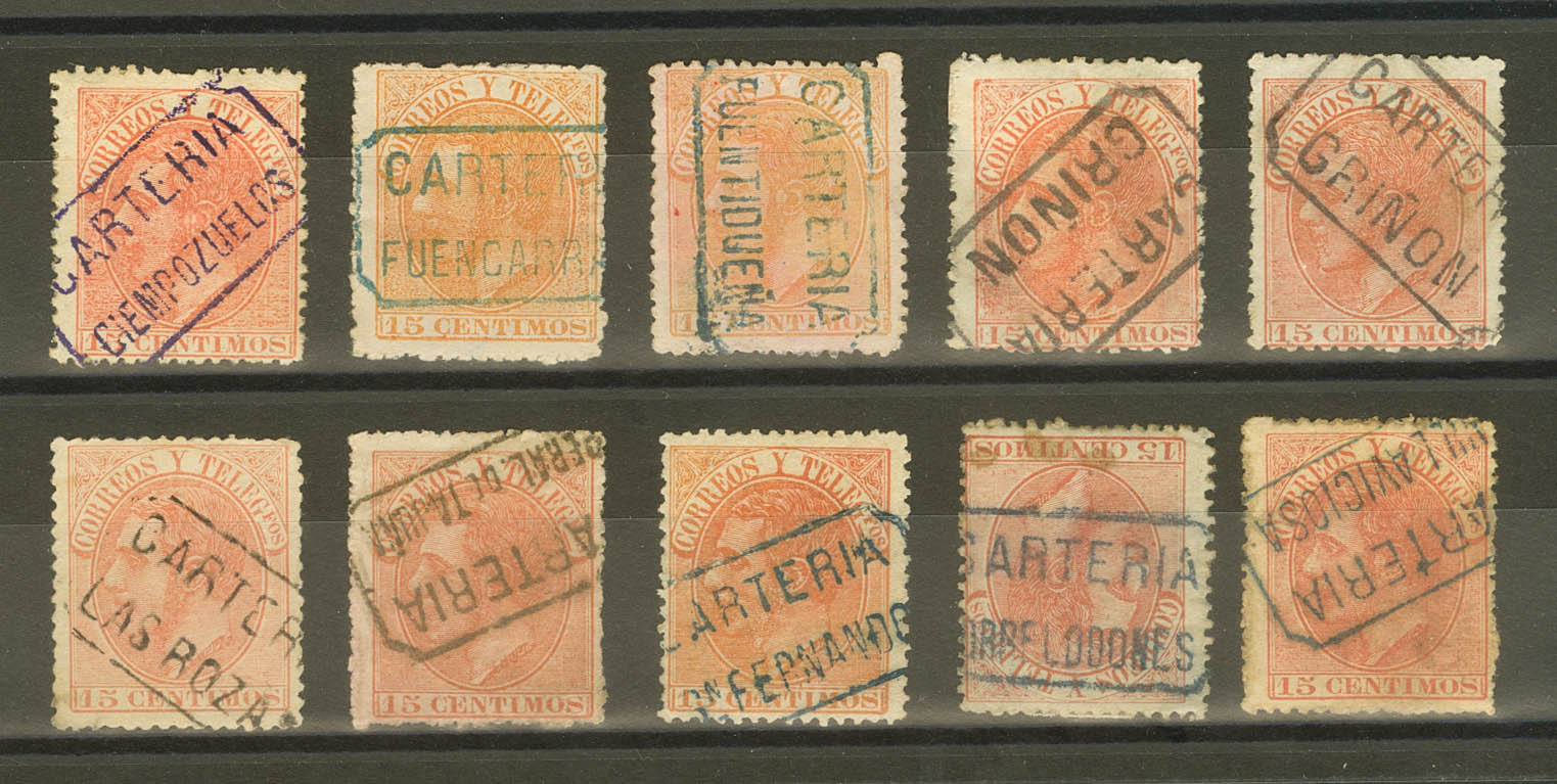 English 210(10). 1882. Set of ten unused 15 ct orange stamps with letter-type postmarks from CIEMPOZUELOS, FUENCARRAL, FUENTIDUEÑA, GRIÑON (2), LAS ROZAS, PERALES DE TAJUÑA, SAN FERNANDO, TORREDOLONES and VILLAVICIOSA, all of them from the province of Madrid. MAGNIFICENT SET WITH SPECTACULAR PRINTS.